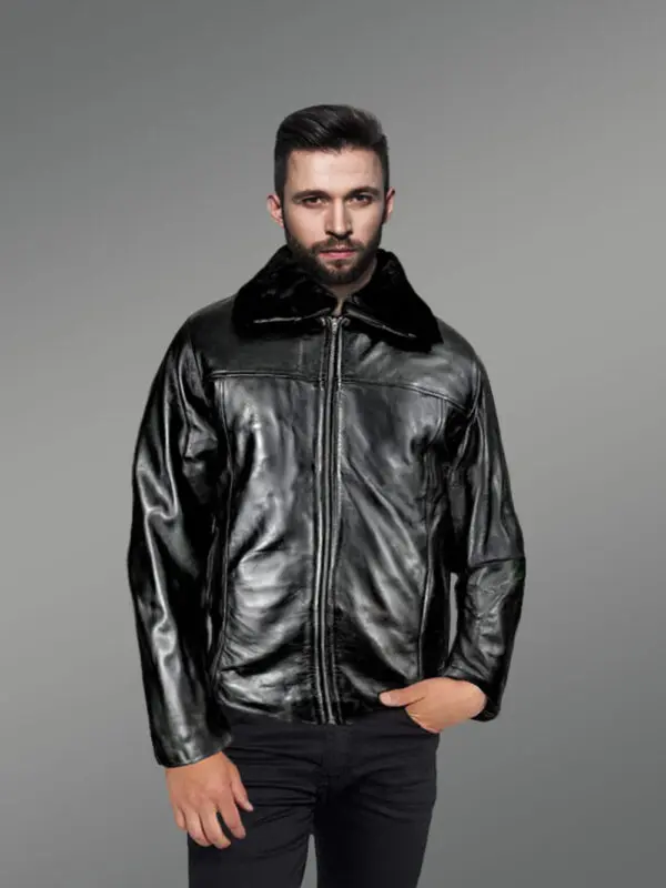 30″ Men’s Real Leather Jacket with Detachable Shearling Collar