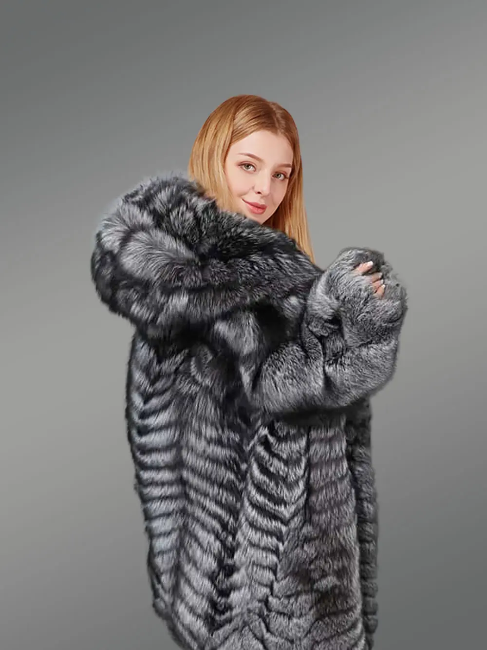 Made from authentic full skin silver fox fur pelts, the mid-length silver fox fur coat radiates unparalleled style and sophistication. The mid-length coat is well crafted with a wide hood, collar and lapel. The entire sectioning of the silver fox fur trench coat is done in arrow format. It is like the pelts are joined together in a manner to showcase the masterpiece. The highly skilled and competent designers have invested their creativity and innovation to enhance the overall look and feel of the plush winter wear range.Â