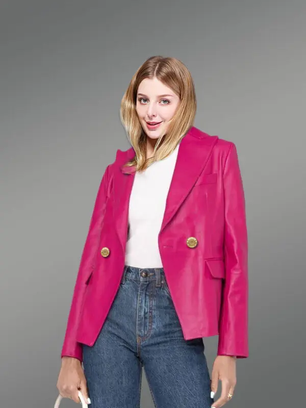 Top grade pelts of the Authentic leather jackets in pink are used in crafting the jacket. The double breasted blazer has a plush pink shade that makes it overwhelmingly feminine. High quality leather ensures soft, smooth and shiny texture. The product line is thoroughly crafted by hand. The appealing blazer has an overall slim cut design with full length sleeves. The sleeves have a set of buttons on the cuffs that easily capture attention. The stylish Authentic leather jackets in pink dressing item is decorated with a front design snap button on each side. Categorically top class buttons are stitched to maintain the class and appeal of the blazer. Those broad, wide lapels make the plush leather item more captivating as well as tasteful. A pocket has been added to the left chest. In addition to that the elegant leather blazer for ladies comes with two stylish, spacious, hand warming side pockets with flap cover. The product range is completely crafted by hand and designed with towering heights of creativity and innovation. Perfect fit is guaranteed for everyone without considering your height or figure. The pink blazer radiates strong feminine charm that is simply hard to resist. You can wear it as a proper dress and can easily attend both formal parties and casual gatherings in it. Carefully designed product line has absolutely flawless finishing.
