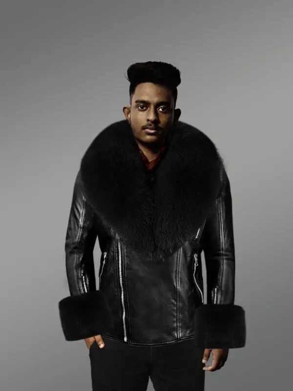 This biker jacket brings the comfort of finest quality lambskin leather along with the warmth of fox fur. Furthermore, it offers the pleasant feel of velvety satin lining to the wearer. Therefore, it will be a valued addition to one’s collection of deluxe winter-wear without any doubt. It has a zippered chest pocket as well as two zippered side pockets to hold one’s personal items with maximum safety.