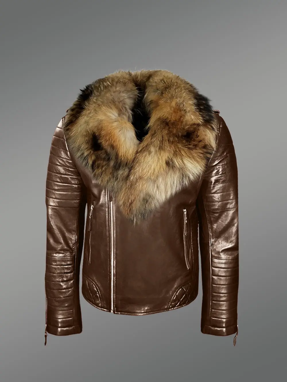 This swanky biker jacket is designed with one detachable collar made of raccoon fur. It features a medley of golden, grey, and black shades and creates an attractive combination with the coffee brown shade. Additionally, this winter-wear has a turned-down collar with a notched lapel for better protection from the cold. Because of the satin lining, it’s markedly comfortable to wear the jacket.Â