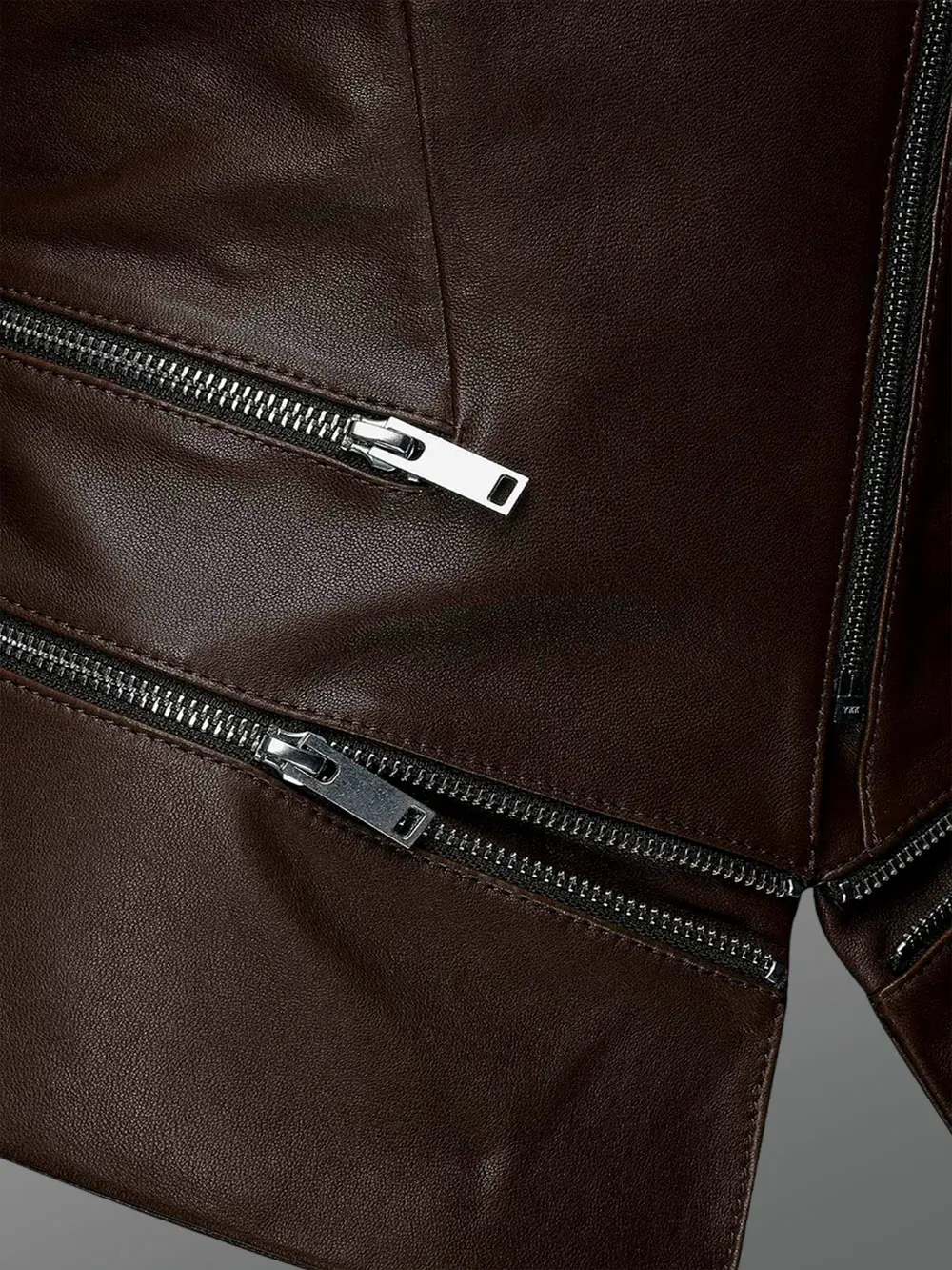 Once observed, the leather outerwear’s construction is rather distinctive, which may be examined. Its novelty is typified by the one-sided collar and zip-out waistband. When zipped up, a single-sided collar mimics the standard collared neck look. An added benefit of the adjustable length is the waistline-mounted zip closure.