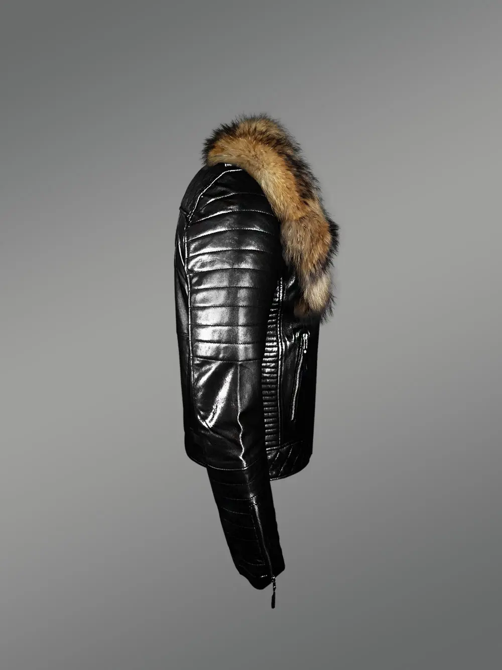 This deluxe black biker jacket with raccoon lapel is undeniably a versatile and gorgeous outfit for the winter. The breathable and ultra-soft lambskin leather feels equally cozy to wear during spring and fall seasons. Furthermore, it is designed with notched lapel of lambskin leather along with a detachable shawl-style lapel of raccoon fur. It also brings the comfort and protection of ribbed quilted leather on the sleeves as well as along the sides and upper back regions of this jacket.