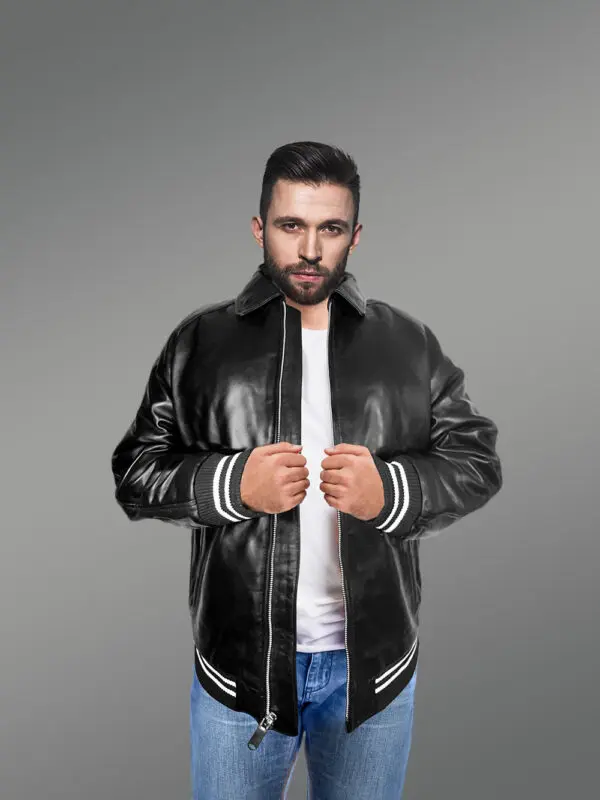 This deluxe black leather bomber jacket is designed to resemble the appearance of a varsity jacket. The semi-aniline finish attributes a soft glow to the lambskin which truly feels markedly smooth to the touch. The minimalistic design gives a semi-formal touch to the casual look of this outfit. Therefore, it’s suitable not only for outings, fests or parties. One may even wear it to semi-formal events to look chic.