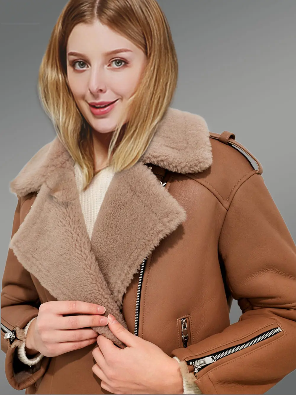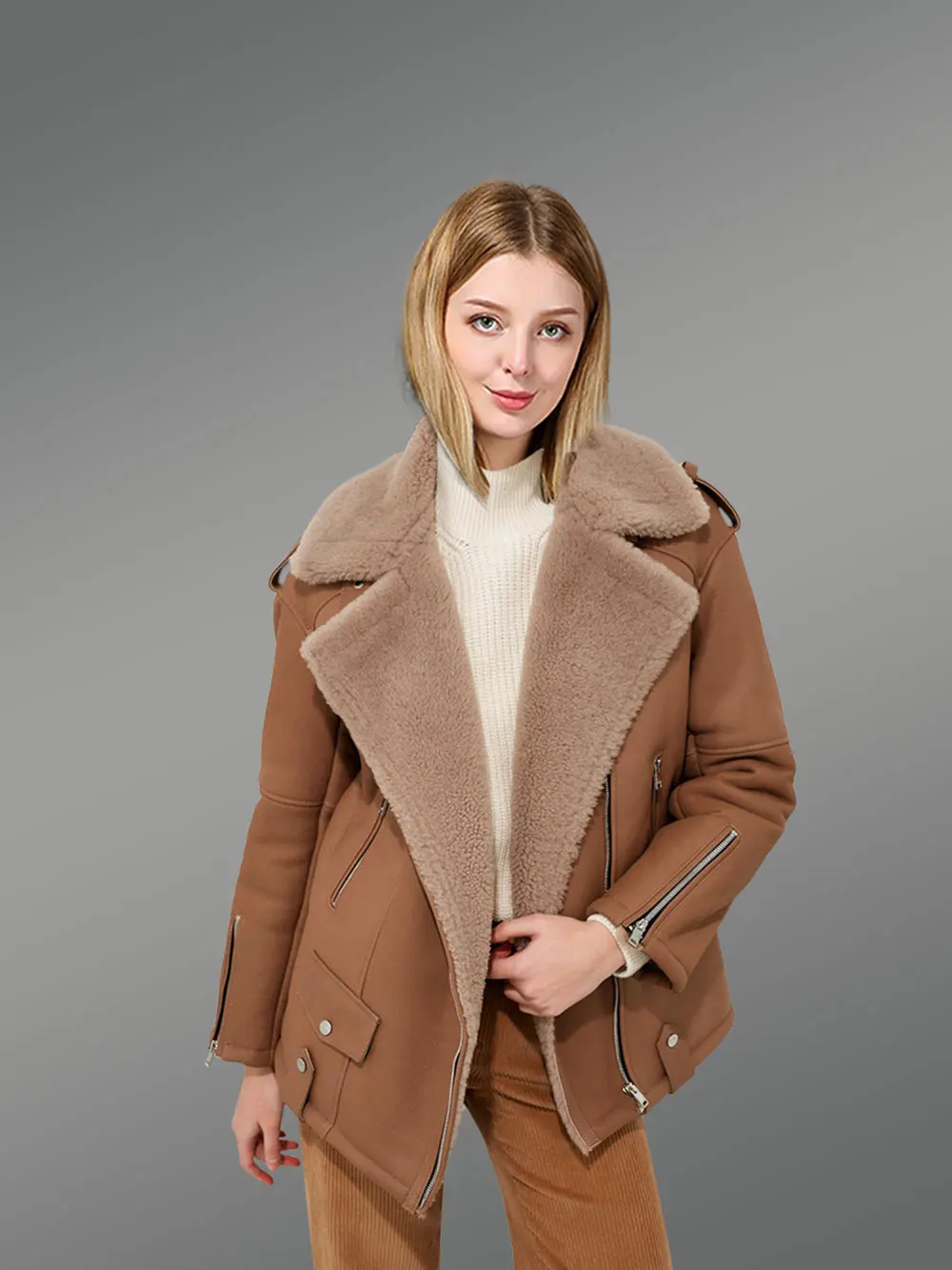 Brown Suede Finish Sheepskin Shearling Jacket for Women