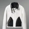 Towering heights of creativity and innovation, the jacket has a separate class of its own. The inner woollen layer of the fabric is fipped and exposed to the outward area of the jacket. This includes the collar, frontline, cuffs of the arms and the bottom edge. The outstanding contrast of the woollen color and the distressed black mades the winter wear look appealing and classing.