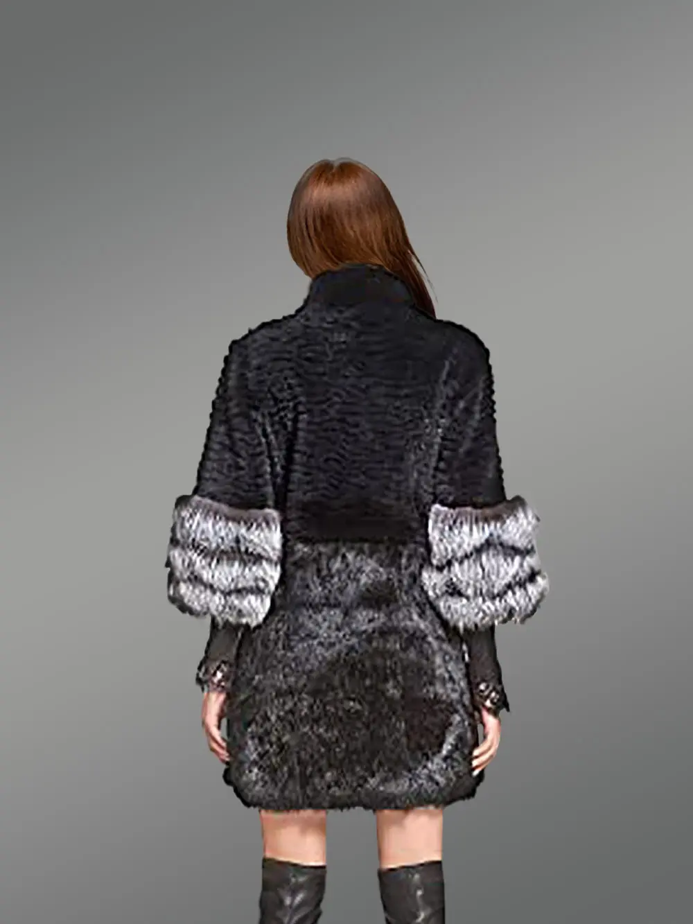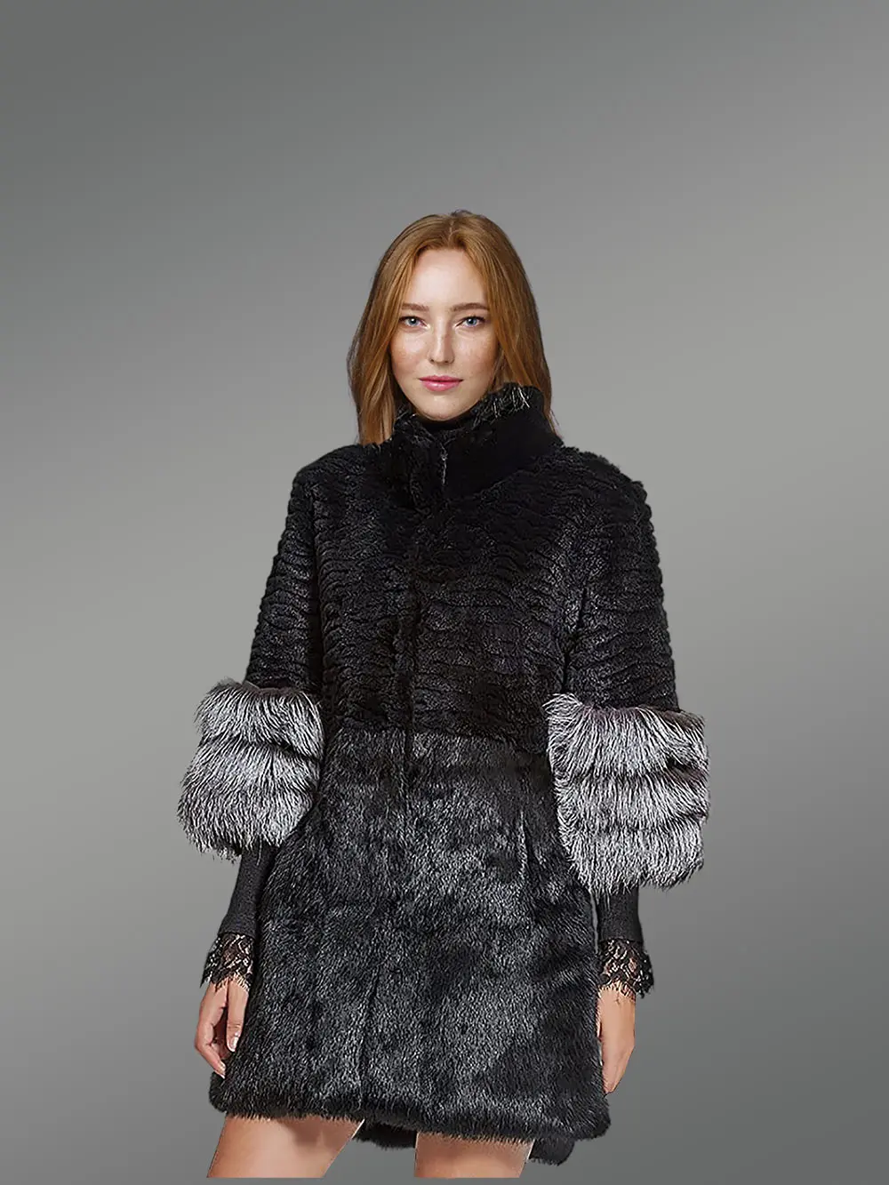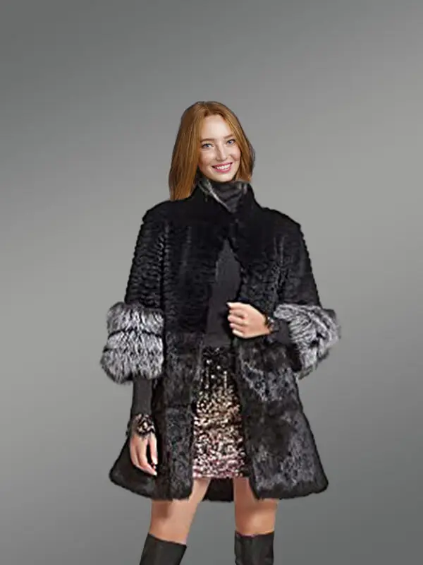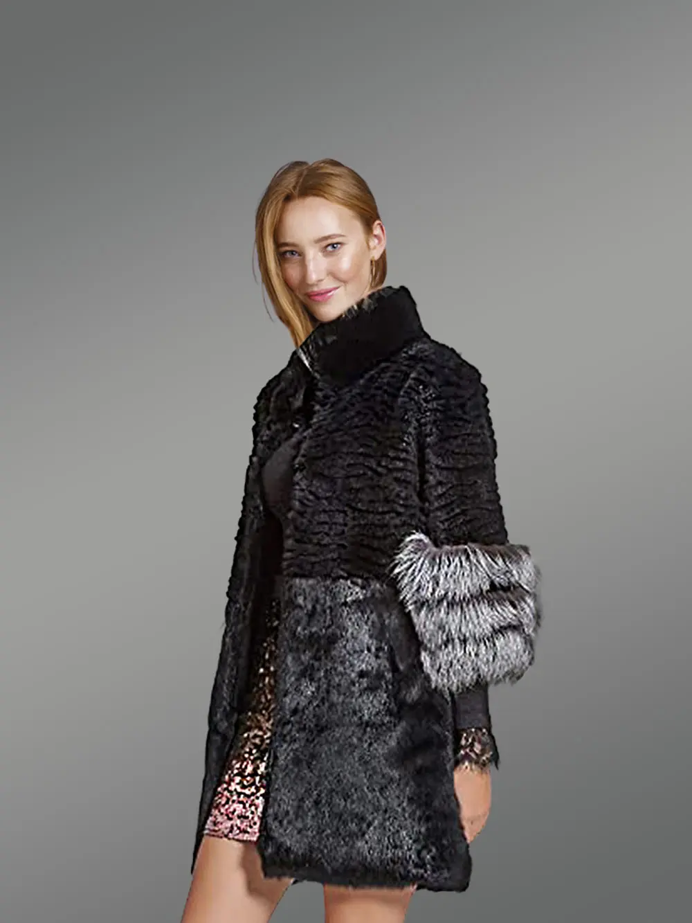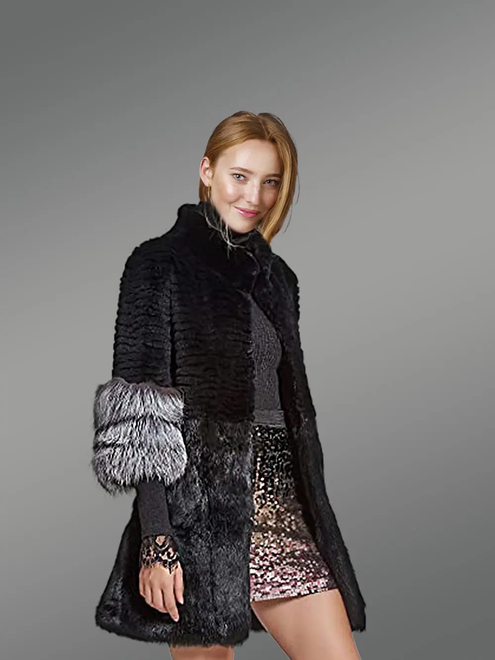 The soft satin lining on the interior will give you increased comfort. This Black Rabbit Fur Coat has a thick stand-up collar. The long-sleeve ends are stitched with long silver fox fur trims. The front-open coat is outfitted with strategically placed premium clip-lock hooks to provide optimum insulation. The design of the two side slash pockets combines comfort and style. The spacious pockets can protect your exposed hands from the chilly elements. Stay brilliantly warm in this coat and pair it with jeans or over dresses. Procuring this stunning gorgeous coat ought to bring out your charming personality.