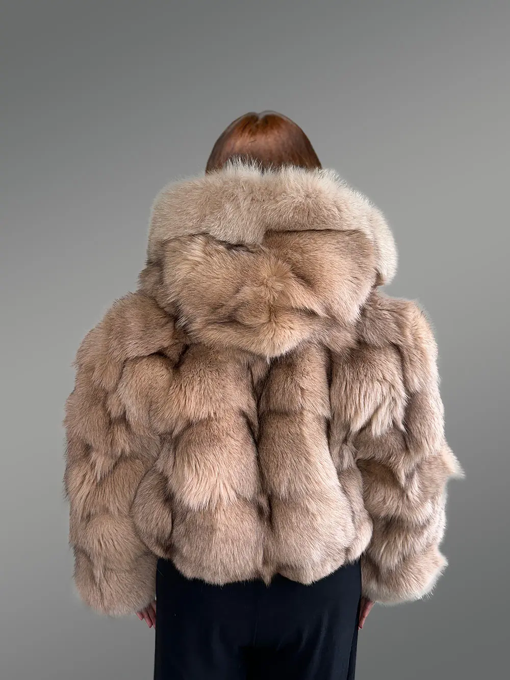 This luxurious womens fox fur crop jacket is designed using sections of fur from Blue Fox. Its wavy texture results from the artistic assembly of sectioned pelts. They are dyed in a soft shade of beige. Alongside making a woman look like a diva, it can keep one warm and comfortable throughout the winter.