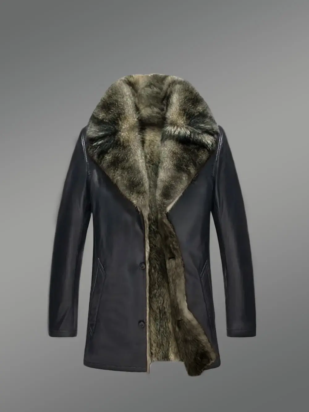 The warmth of Silver fox fur is also felt through the broad regular-style collar of this long coat. With notched lapels, it offers protection to the neck and front part of one’s body. Also, it enhances the aesthetic appeal of this outfit. Color of the fur creates a striking contrast against the black sheepskin leather.
