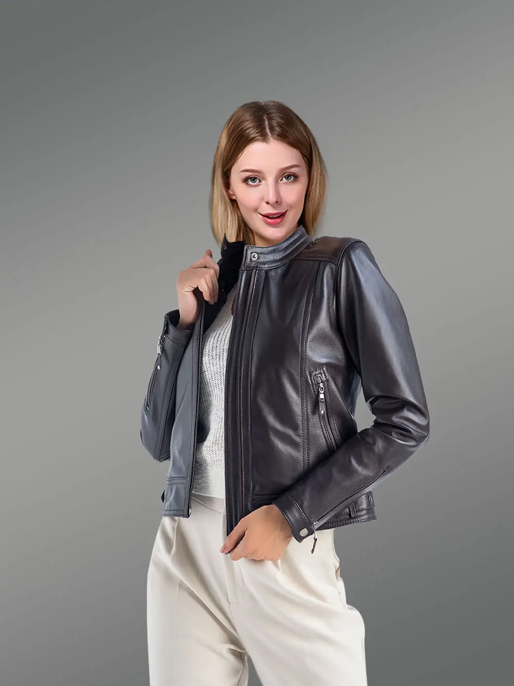 This is a cropped jacket and is used especially by women bikers or riders. A distinct hemline with a unique stitch pattern creating a wide waistline is adorned with leather belts. Two in-built small leather belts with loops and buckles for fastening are at the two sides. The inner lining with silk-satin material and the perfect fittings of this winter outfit enhances the girlish charm of the wearer.