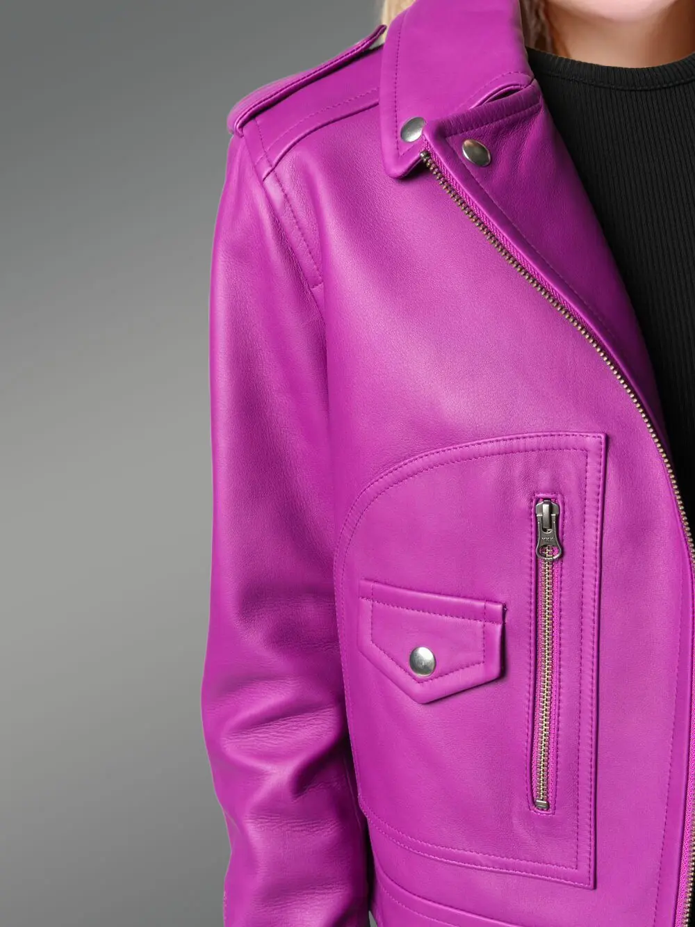 The jacket is made from authentic pelts of the premium range Italian-finish leather. It reflects rich Genuine leather jackets in purple that is undeniably feminine and gives out a powerful magnetic effect to make you the center of attraction in any crowd. High quality leather has rich shiny texture and is luxuriously soft as well as lightweight. The Genuine leather jackets in purple has full length sleeves decked with stylish zippers at the cuffs. Designed with great care and caution the jacket has distinct collar and lapel that are decked with front design snap buttons. By virtue of straight point collars the jacket has a simple neckline as in ordinary shirts. Furthermore it has smart shoulder straps. High quality zippers are installed to keep you warm and cozy in outdoors during severe cold weather. The zippers are placed little on the left. There is a slanting, zippered, stylish and spacious hand-warming side pocket on the left while on the right it has a straight zippered pocket. In addition to that there is also a tiny pocket on the right with conventional button closure. The appealing purple leather jacket radiates a unique feminine charm that is simply impossible to resist. The jacket has straight hemline. Moreover it has immaculate inner lining made of pure silk. Fit to size is guaranteed for everyone without caring for your height or figure. Designed with towering heights of care and precision the chic leather jacket for women comes with absolutely flawless finishing. You can wear the innovatively designed warm clothing item as a proper dress. This is indeed your most assured alternative to appear smarter, classier, hotter, sultrier, more dignified, appealing, stylish, tasteful and elegant.