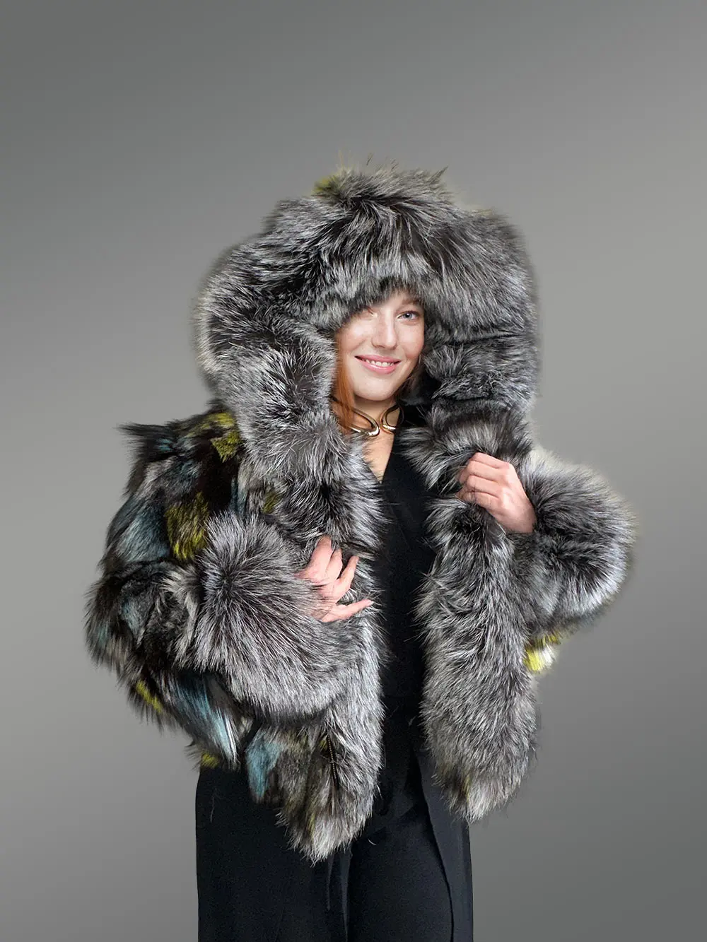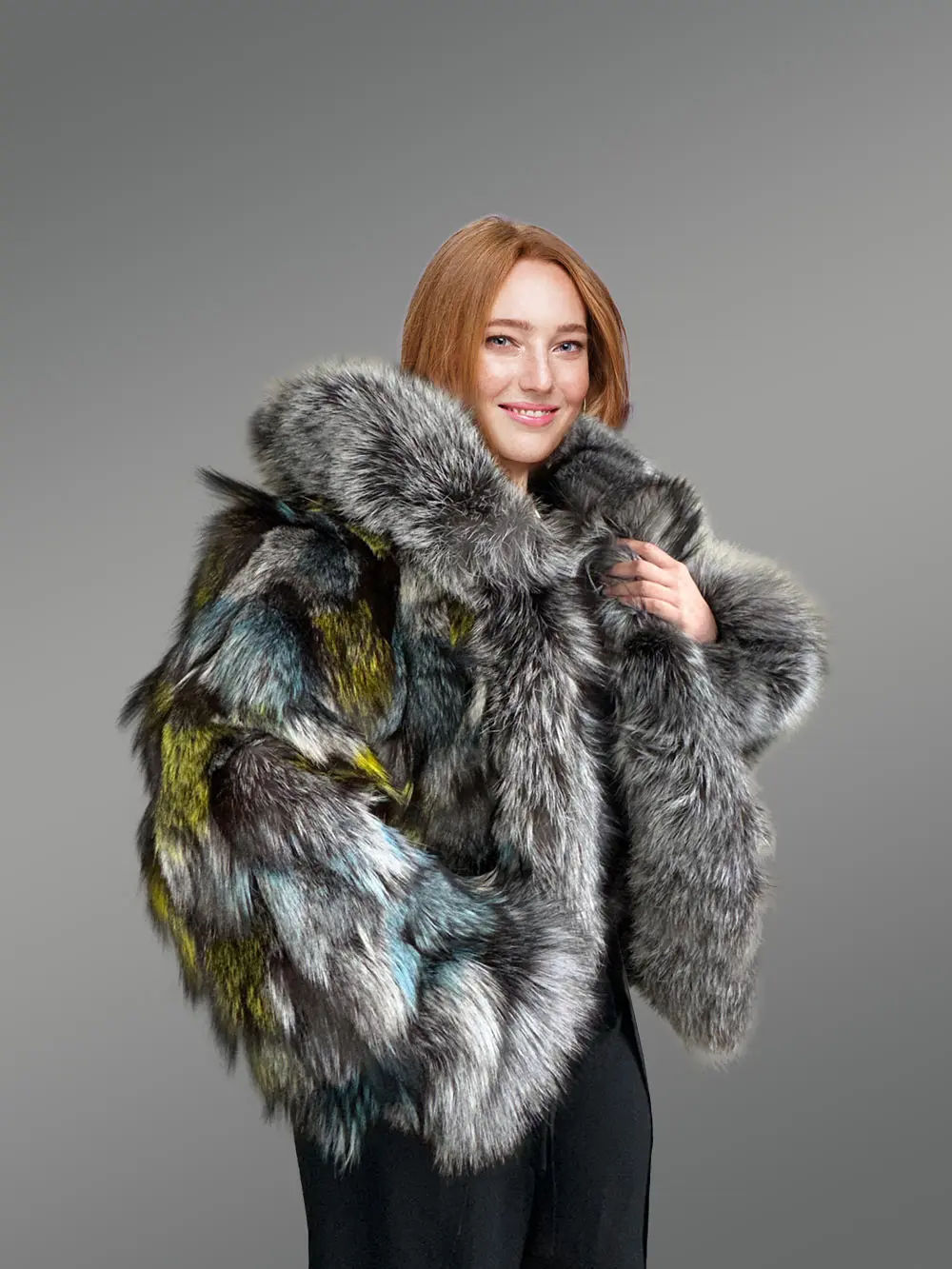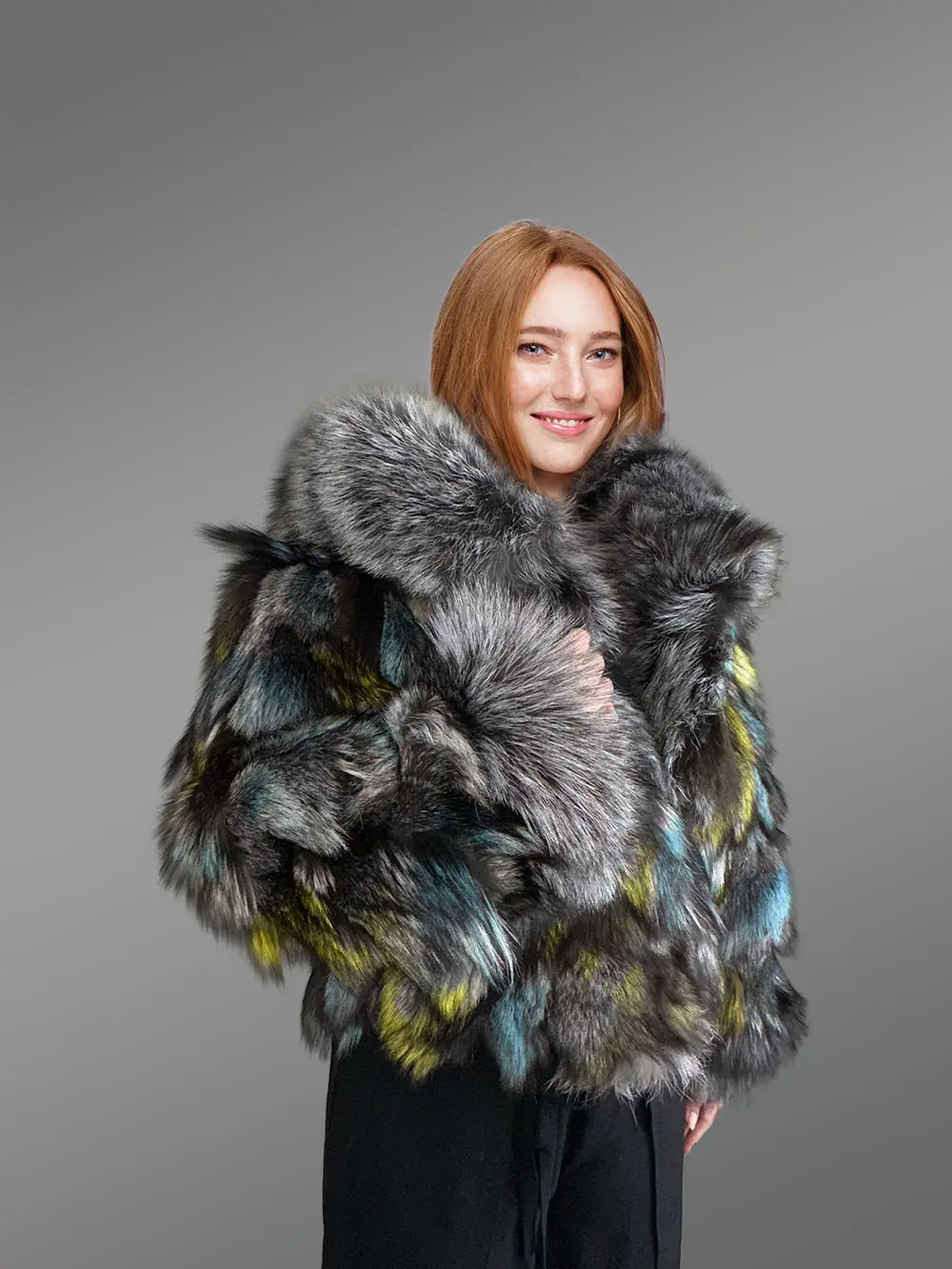 - Magnificent jacket of Silver fox fur handcrafted using multi-colored pelts