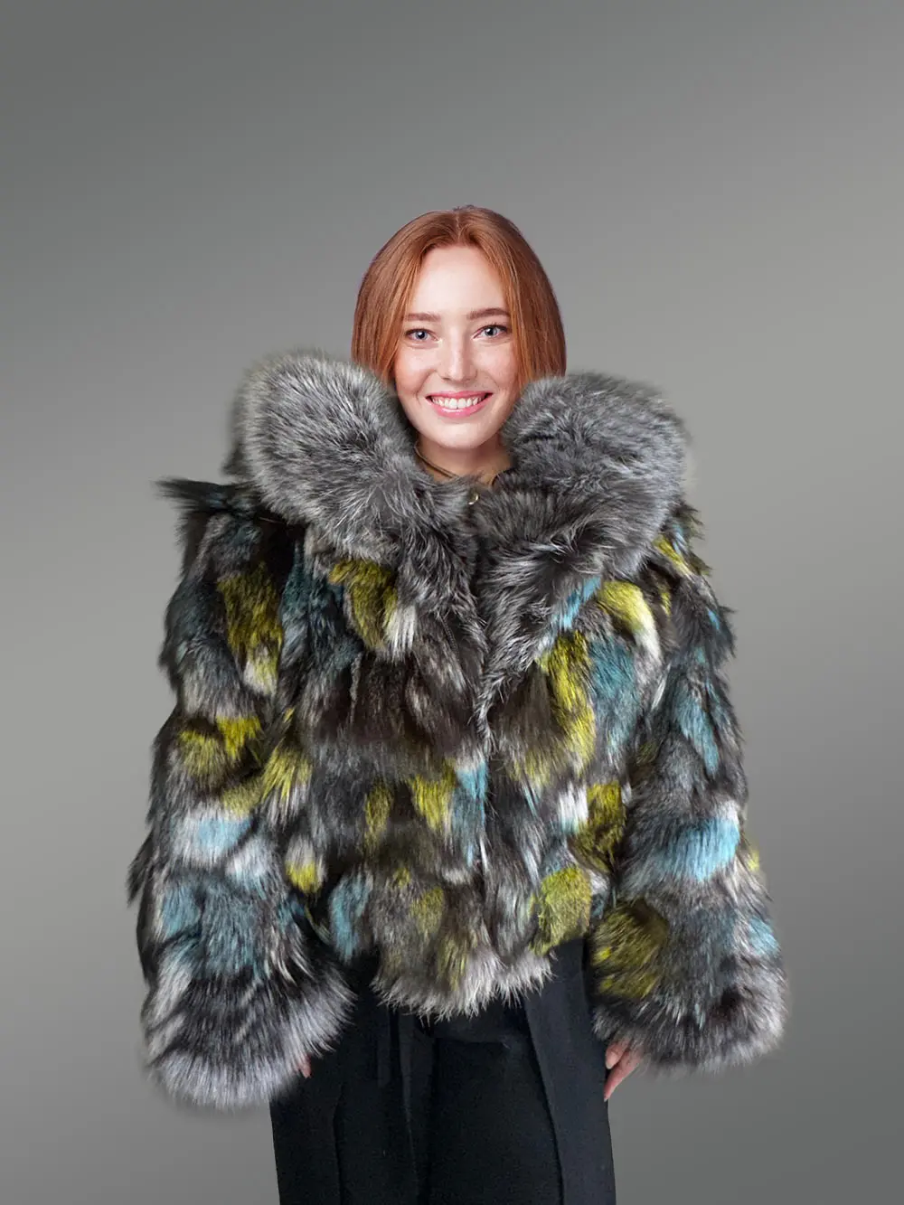This exquisite hooded silver fox crop jacket looks spectacular in dyed pelts of varying shades. It features a wavy texture due to being designed with sectioned pelts of Silver fox. The aesthetic arrangements of the colorful pelts undeniably raise the glam quotient of this outfit. The non-dyed pelts of Silver Fox create a marvelous combination with the colorful pelts. It certainly gives a glamorous touch to this outfit.