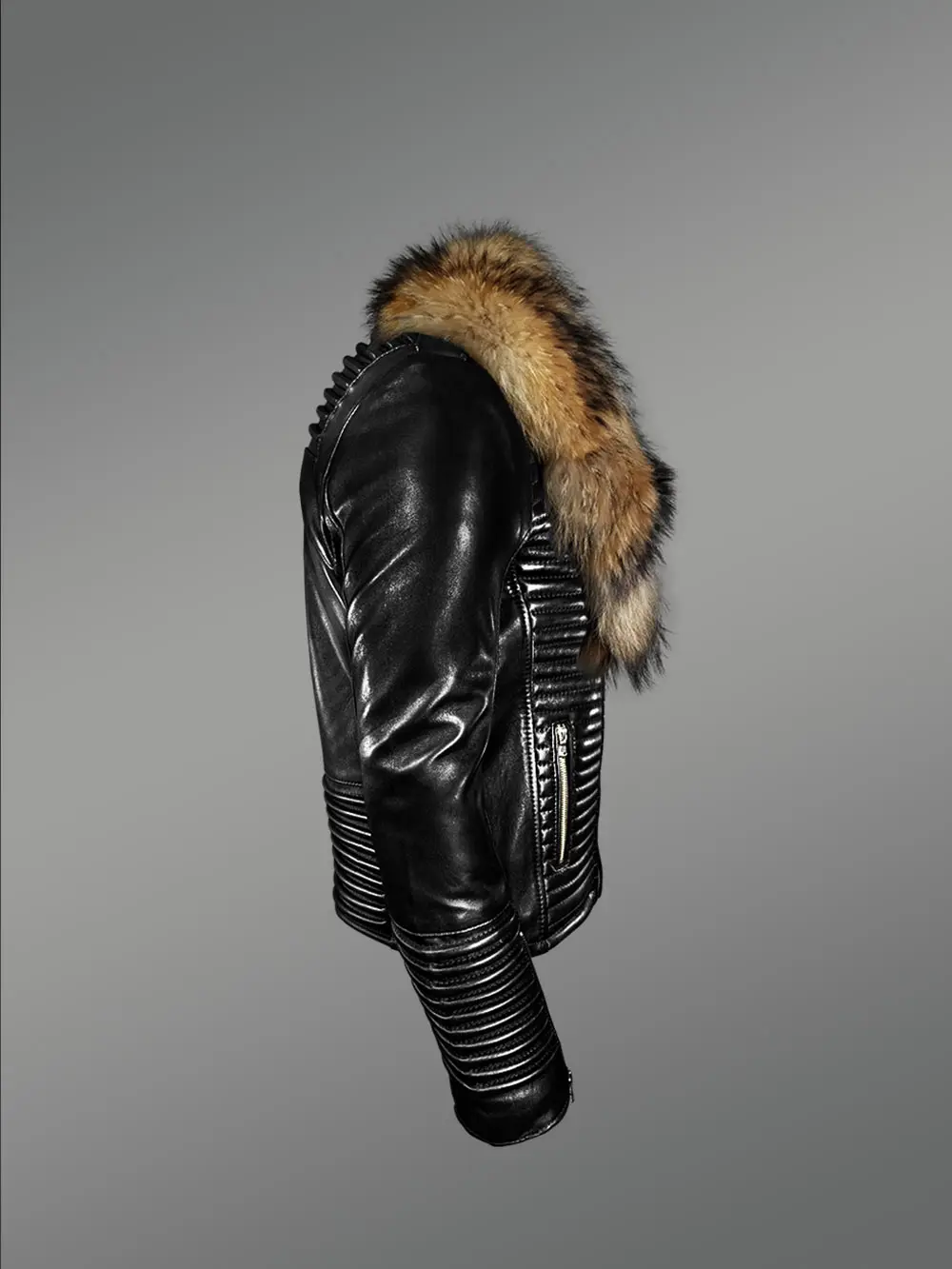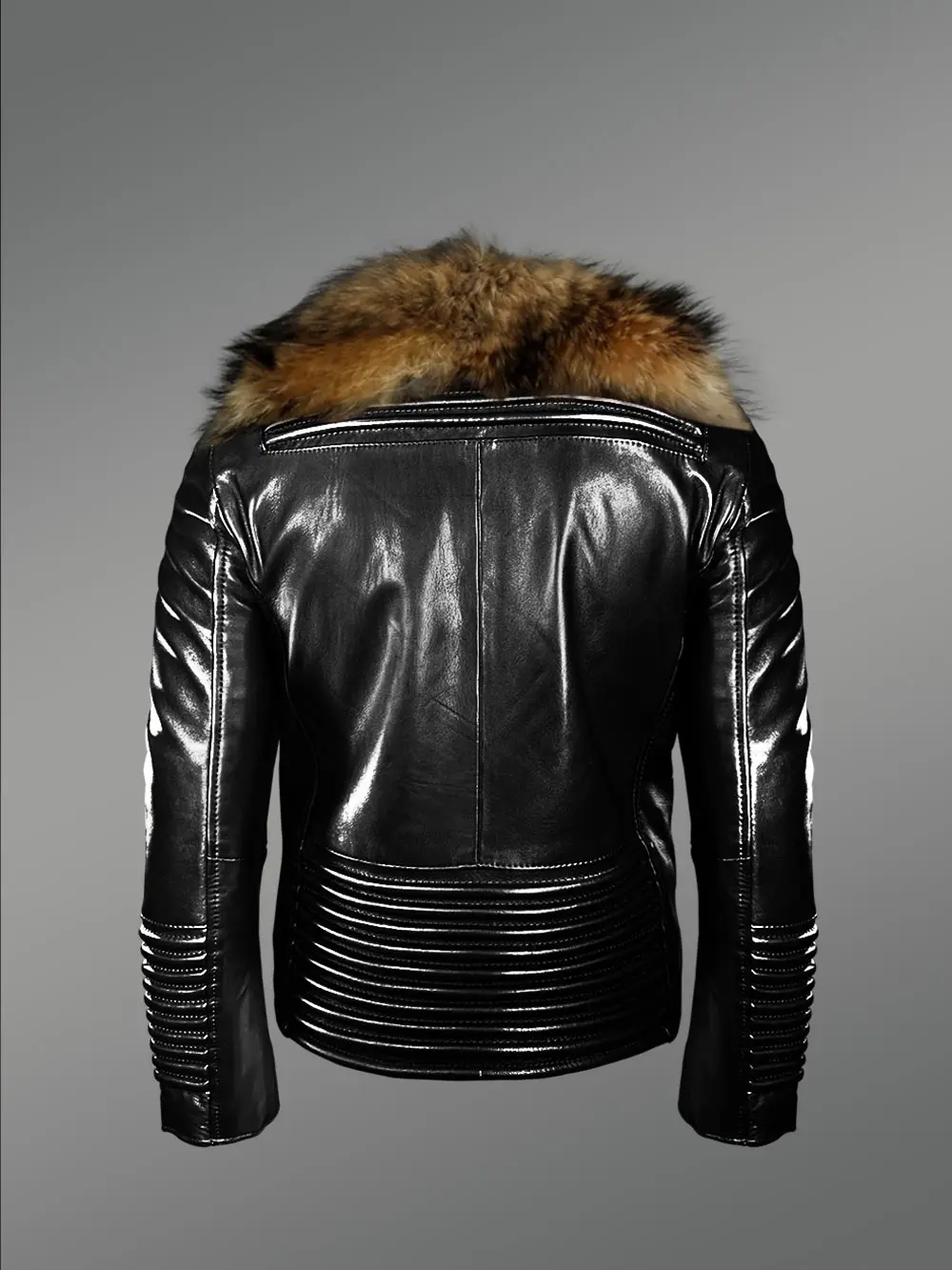 Description: If you prefer to create your own unique style statement, this is the perfect Leather Moto Jacket for you. Small parallel quilts all over the body, long quilted sleeves with zipped wrist closure, asymmetrical front zipper closure, perfect fit, and real raccoon fur collar are the main specialties of this Biker Leather Jacket . For a strong yet impressive look, try this Leather Moto Jacket this fall!
