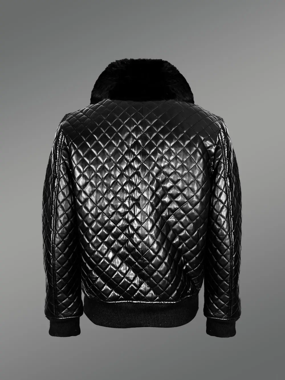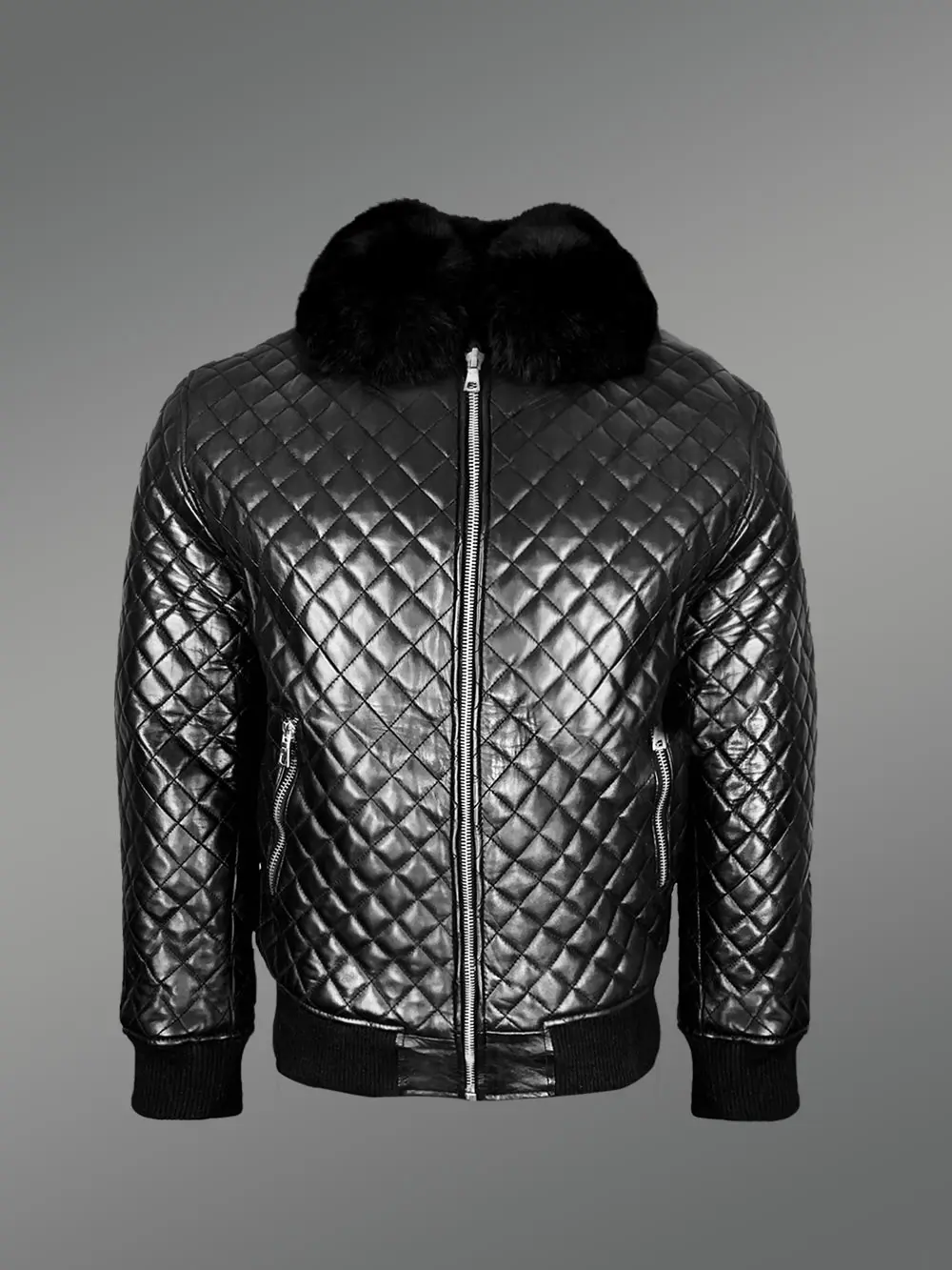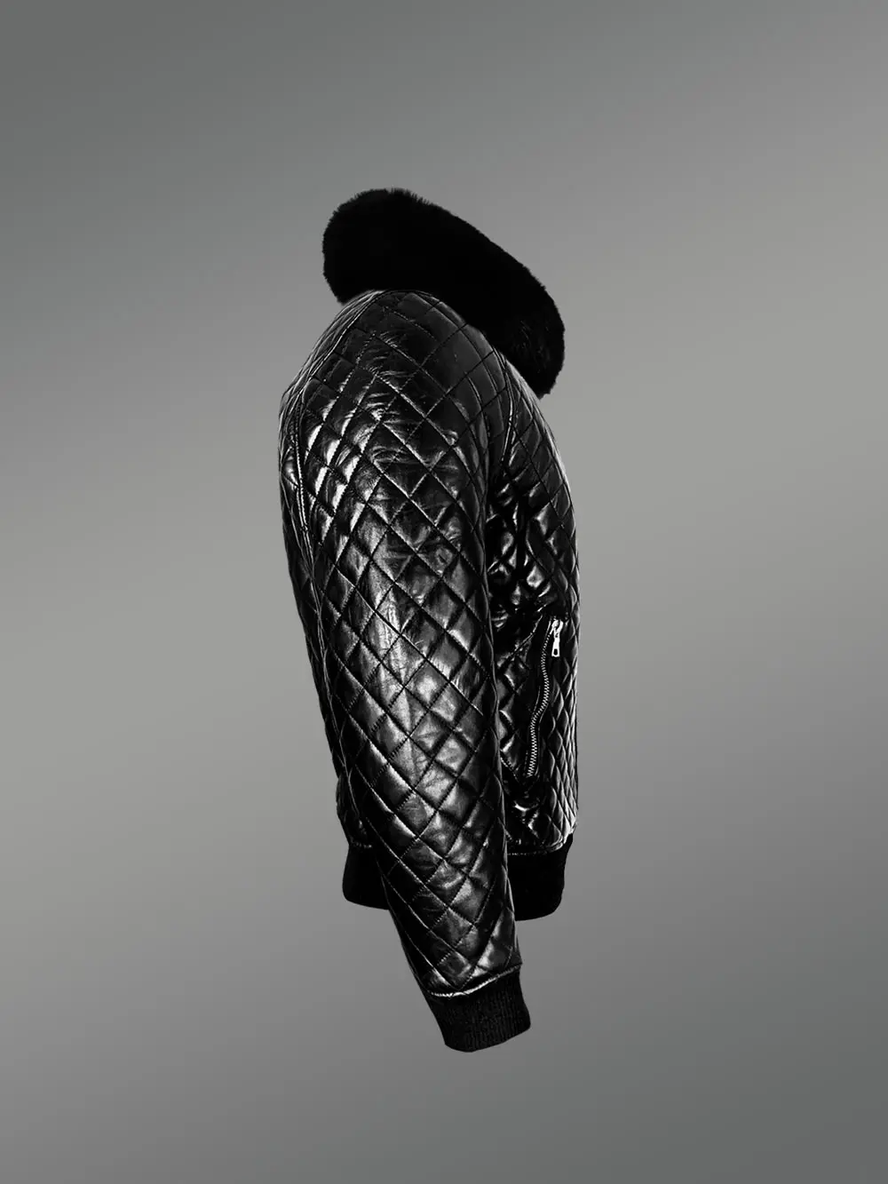 Leather Quilted Bomber Jacket with Fox Fur Collar