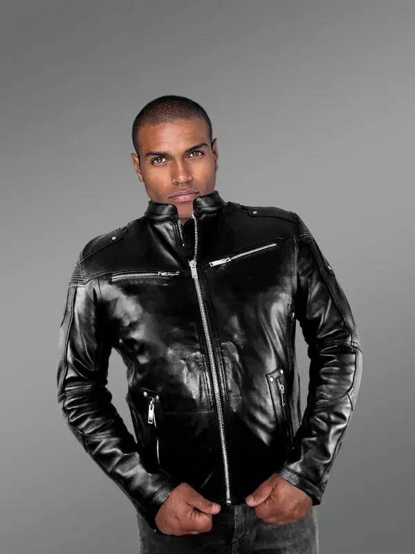 This sophisticated mens black lambskin leather jacket strikes a perfect balance between great looks and practical features. This isn’t just a fashionable outfit. It keeps one comfortable with the warmth of natural leather. Designers have used premium quality leather to handcraft an outfit which is going to last for decades with proper maintenance. It has stand collar and long sleeves for maximum insulation from the cold air. It also brings the soft touch of satin lining and convenience of zippered pockets.