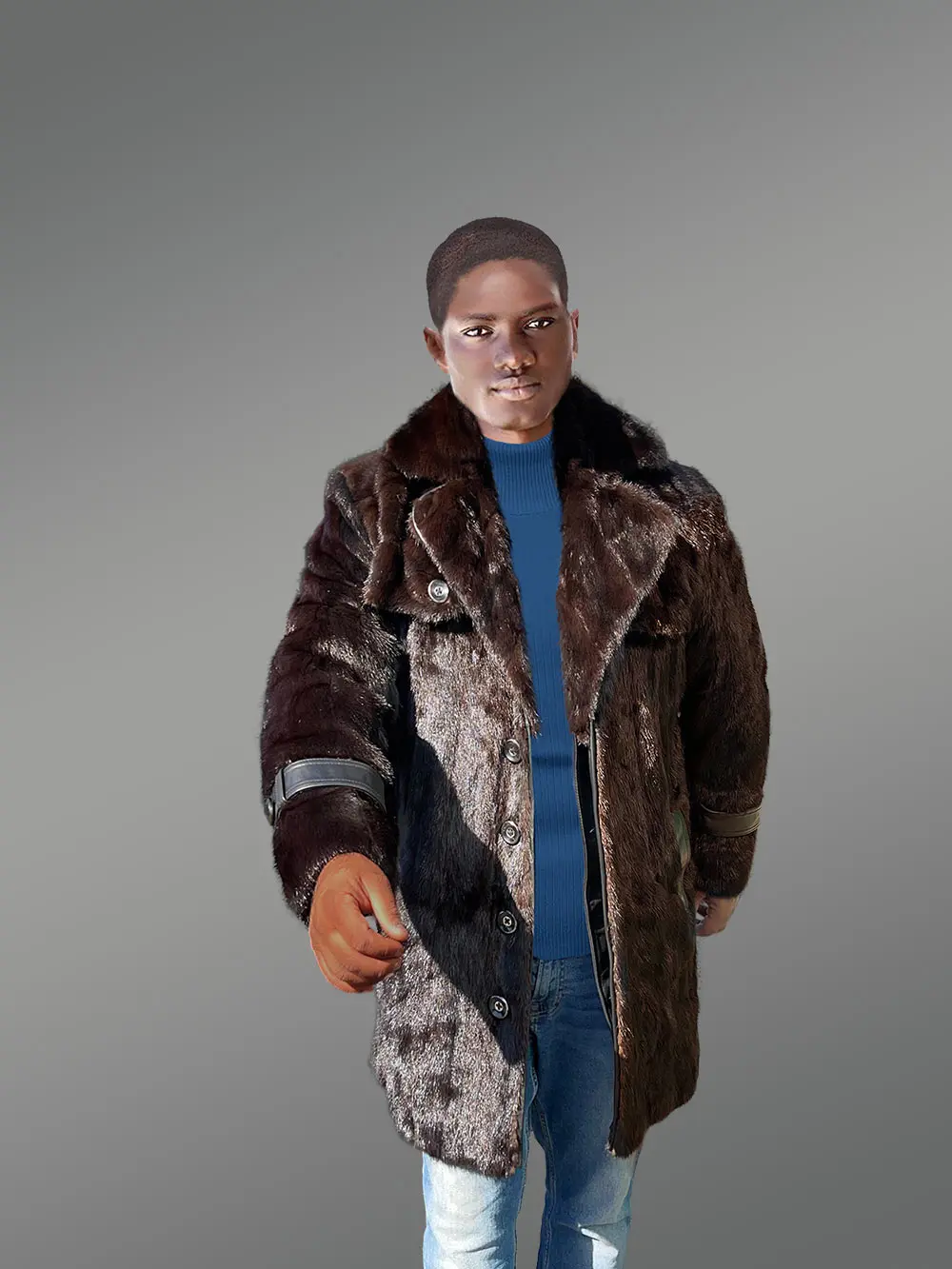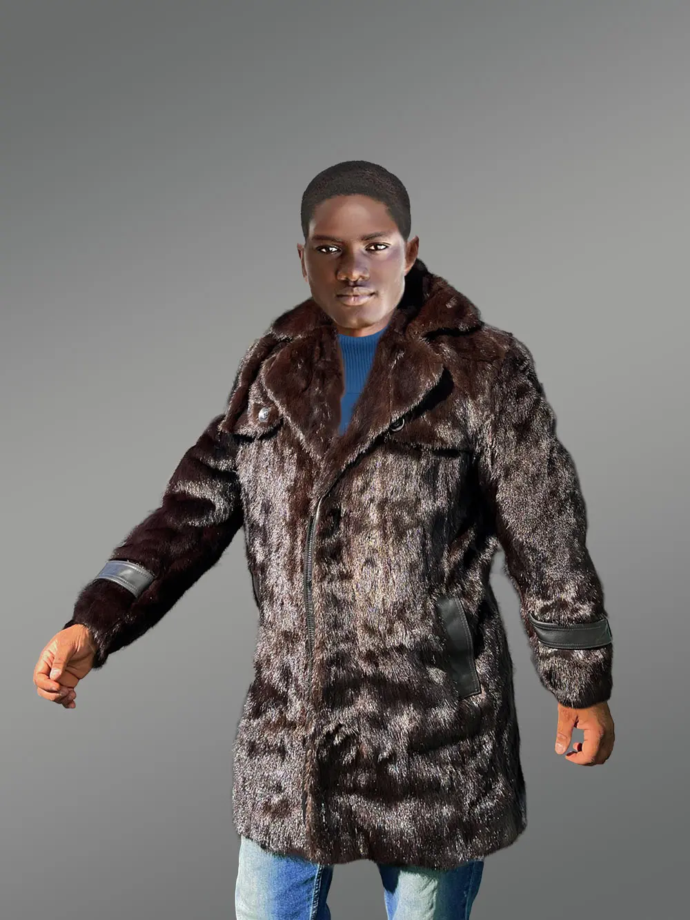 The fur is brown and has a shiny appearance. It looks great on a tall person however this can also be good on medium-height people. The lapel collar is unique in this outfit. It has three folds or cuts, which is a unique design. Near the chest area, there are flip covers with big snap buttons.