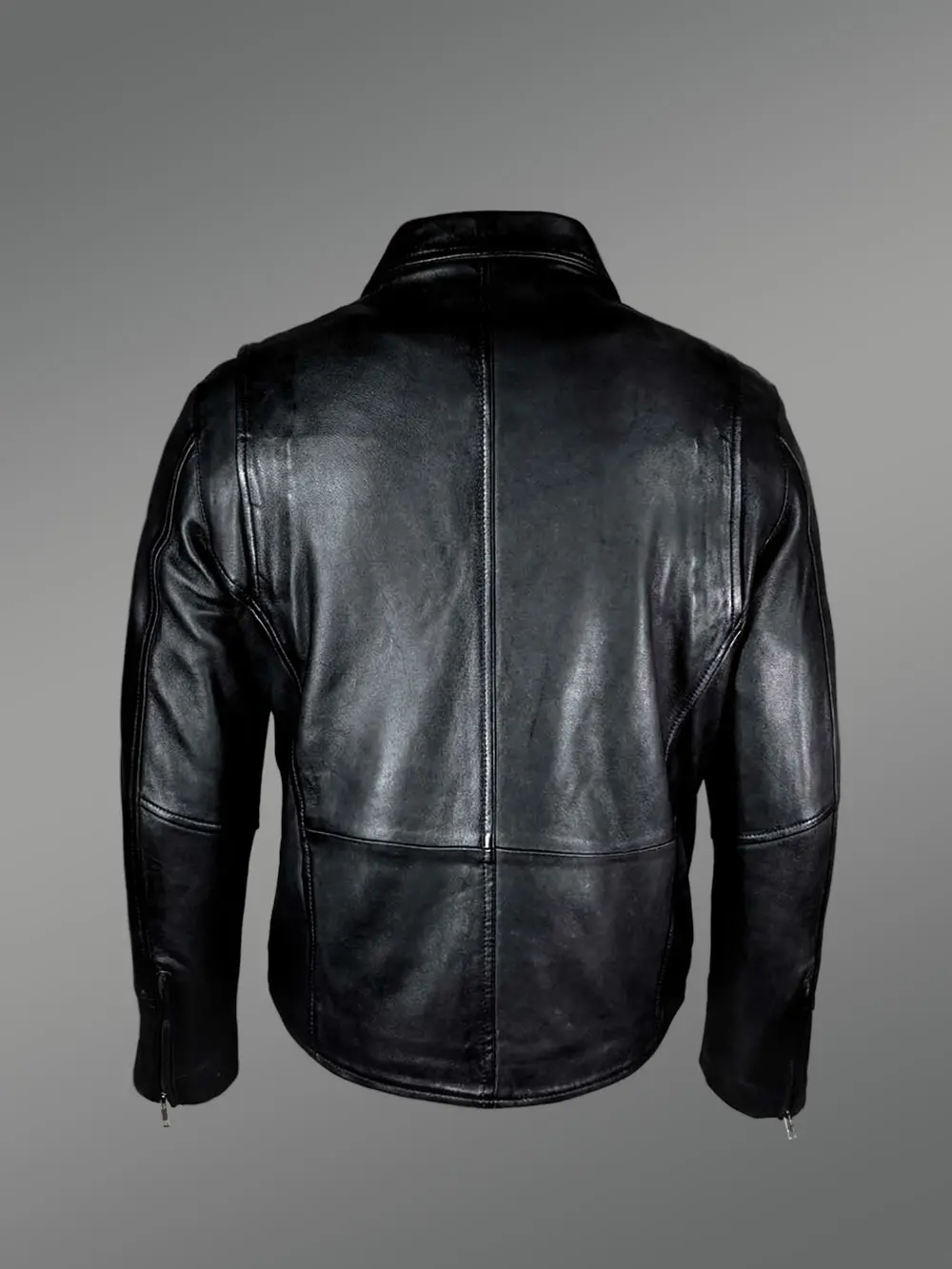 Specification- Men’s pure Italian leather finish black jacket with long sleeves is now available at Furrik. Firm stand collar and cross pockets are there to add a stylish impression to the wearer. Satin lining is adding a classy glow which you can enjoy on any occasion.