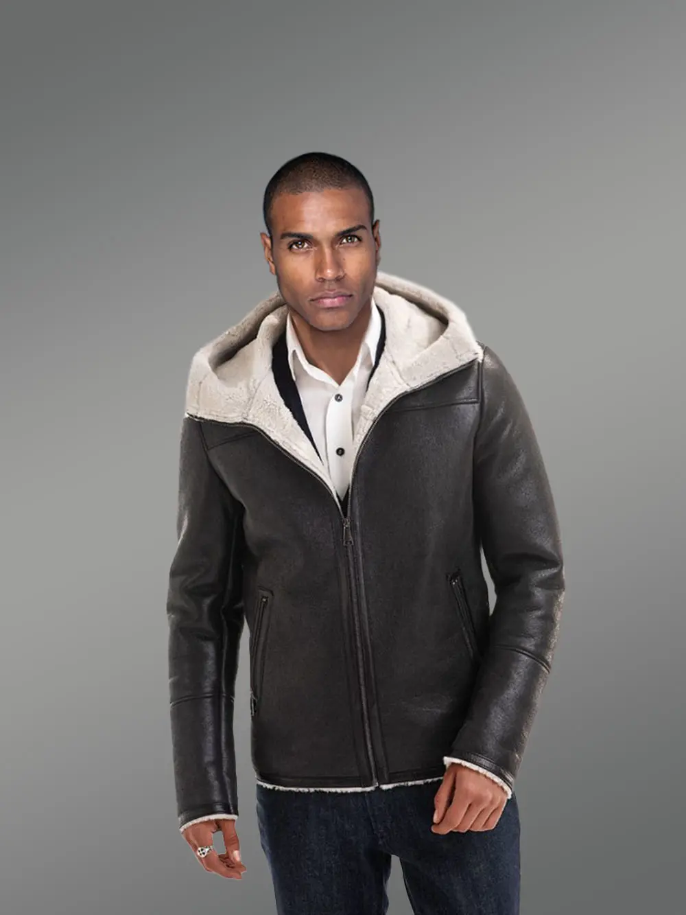 The inner fur side is flipped and exposed at the collar. The collar is attached to a hood that has the same shearling skin outside and fur surface inside. The inner trimmed surface in white is exposed at the sleeve edges and the hemlines. The front open shearling jacket has a zip-lock front closure. This front closure extends till the collar end.