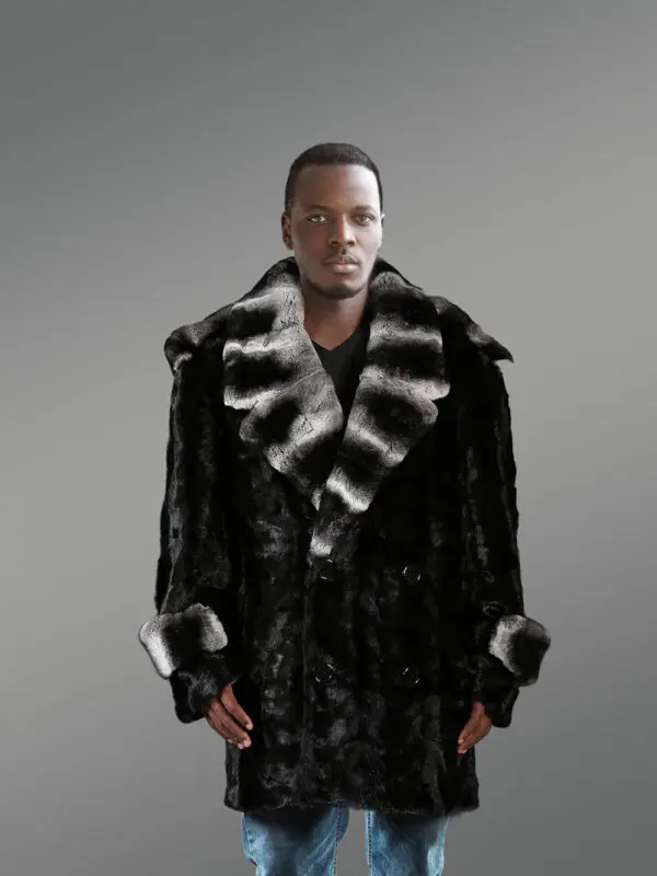 Mens stylish black mink coat with modish lapel of Rex Rabbit fur