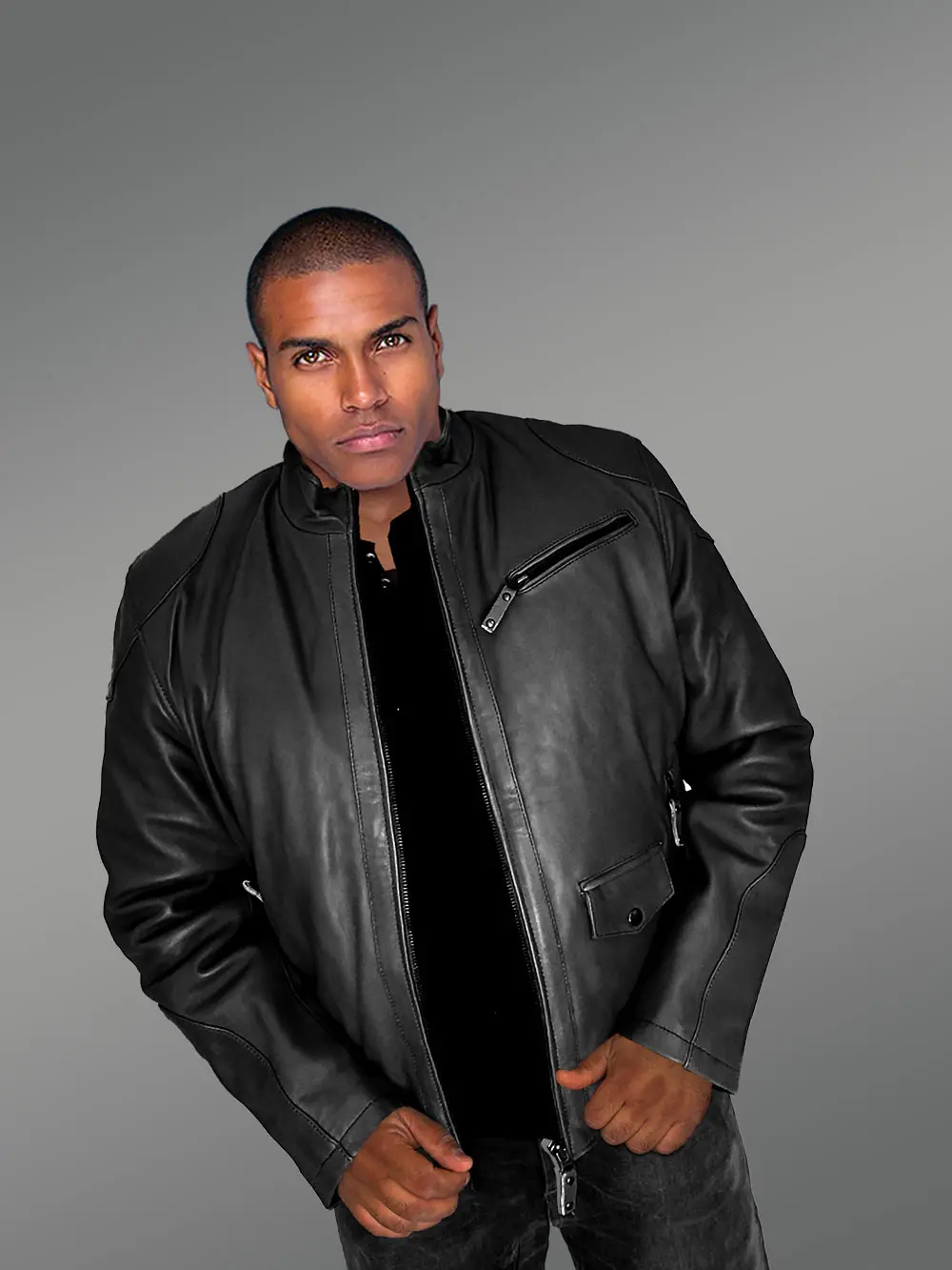 This mens trendy leather bomber jacket features a quilted form at the backside of the shoulder and on the shoulder blades therein offering a cool comfy look. Furthermore, it looks stylish with a zippered pocket on the left side of the chest. Just beneath this zippered pocket, there is a buttoned pocket for carrying some basics. There are two slit-style zipped pockets on either side of the jacket above the hemline for keeping other essentials. A centrally placed metal zipper closes the entire coat in maximal warmth thereby providing absolute restfulness to the wearer.