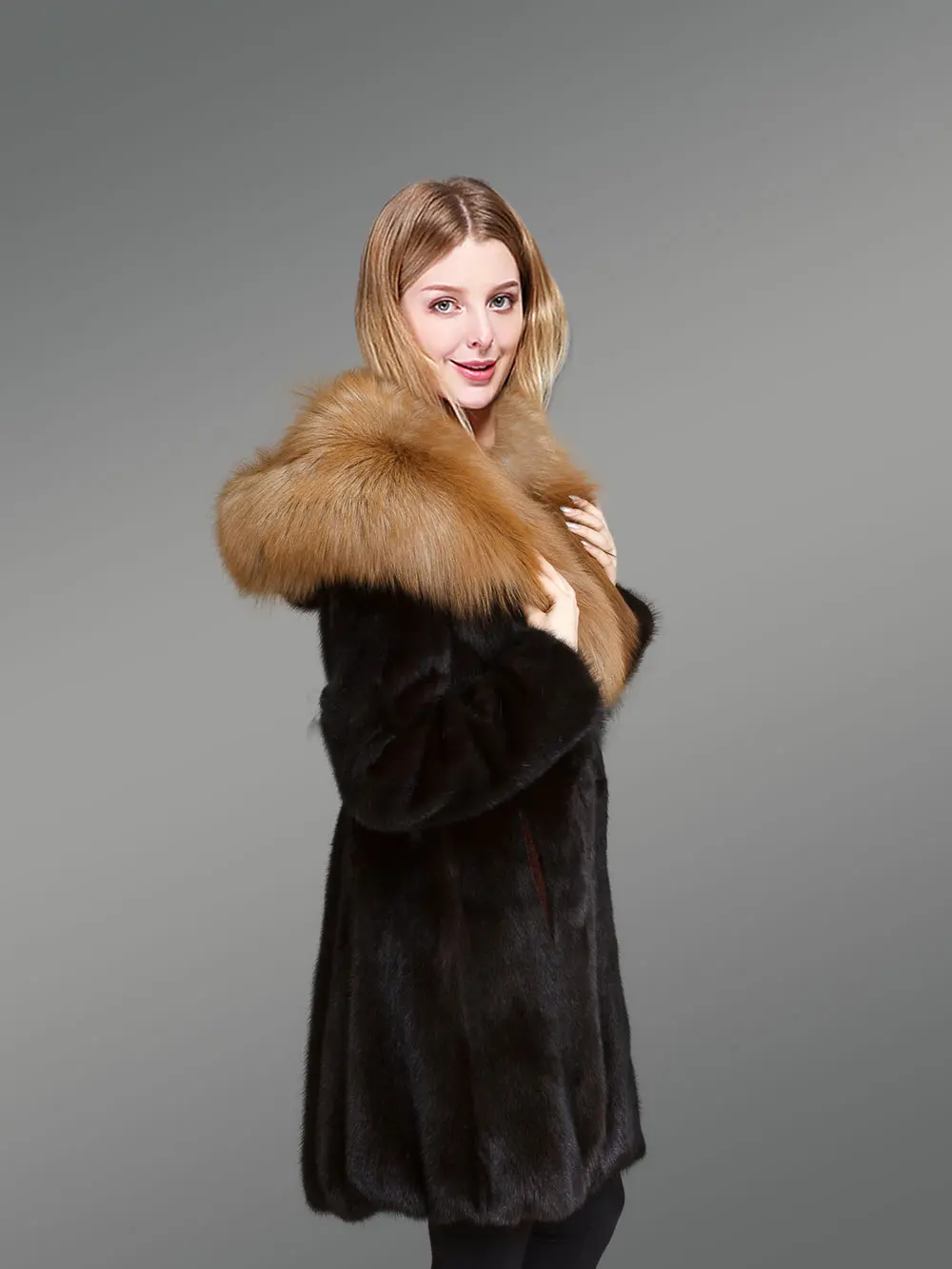 Mink Fur Coat with Red Fox Fur Hood and Lapels for Women