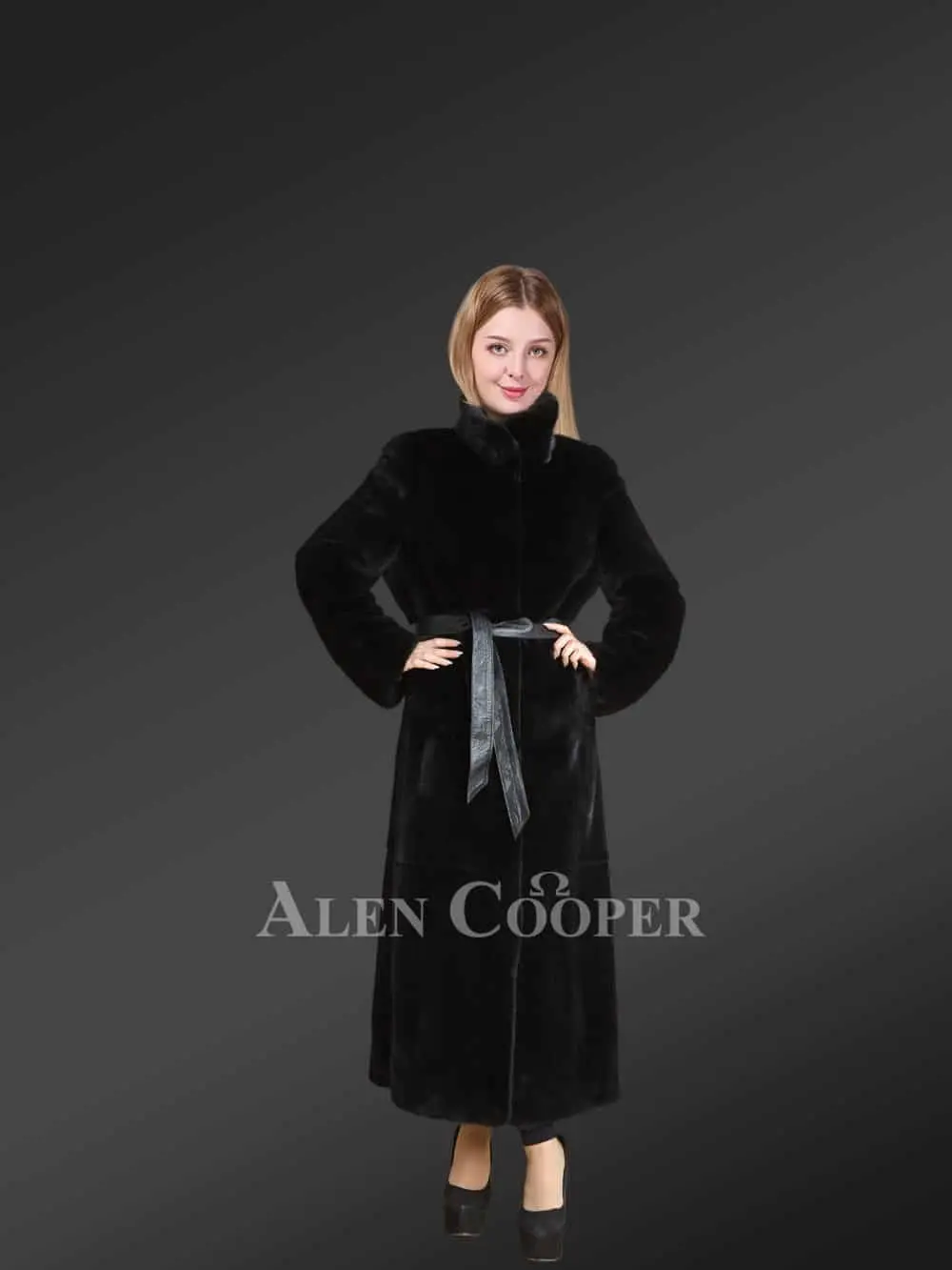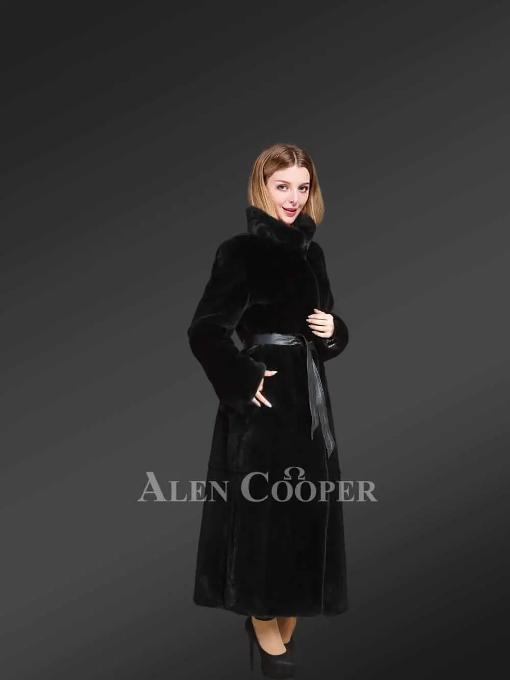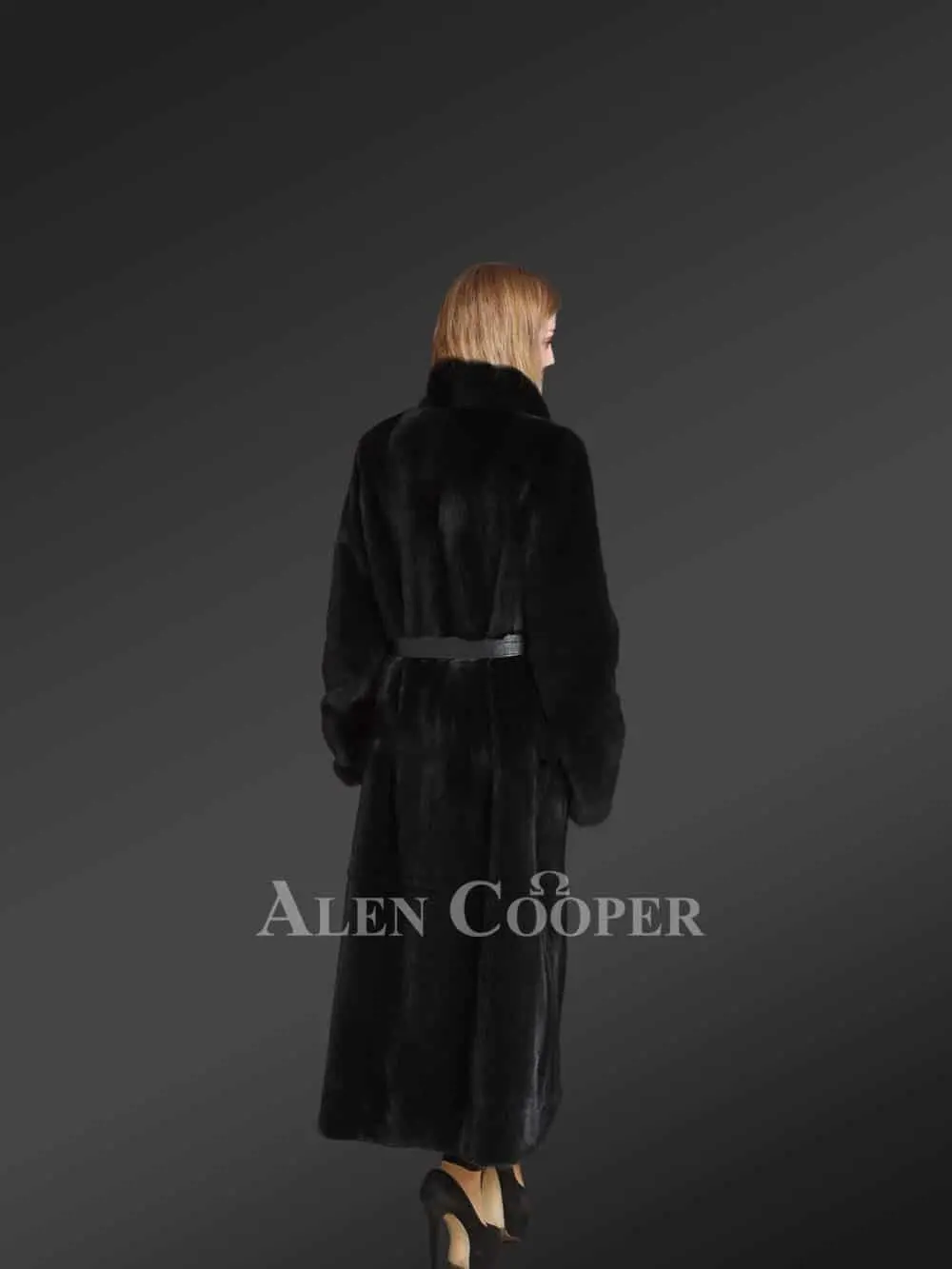 Designers have handcrafted this long coat to perfection with attention to every detail starting from the selection of premium material to creating a perfect union between aesthetics and functionality. The design of this coat can make any woman look classy with a dynamic personality. At the same time, it offers all-round protection in colder months. The length of this coat touches the ankles. The long sleeves fit comfortably and cover the arms along with a part of the palms. The turtleneck collar embraces the neck in cozy warmth of mink fur with a plush feel.