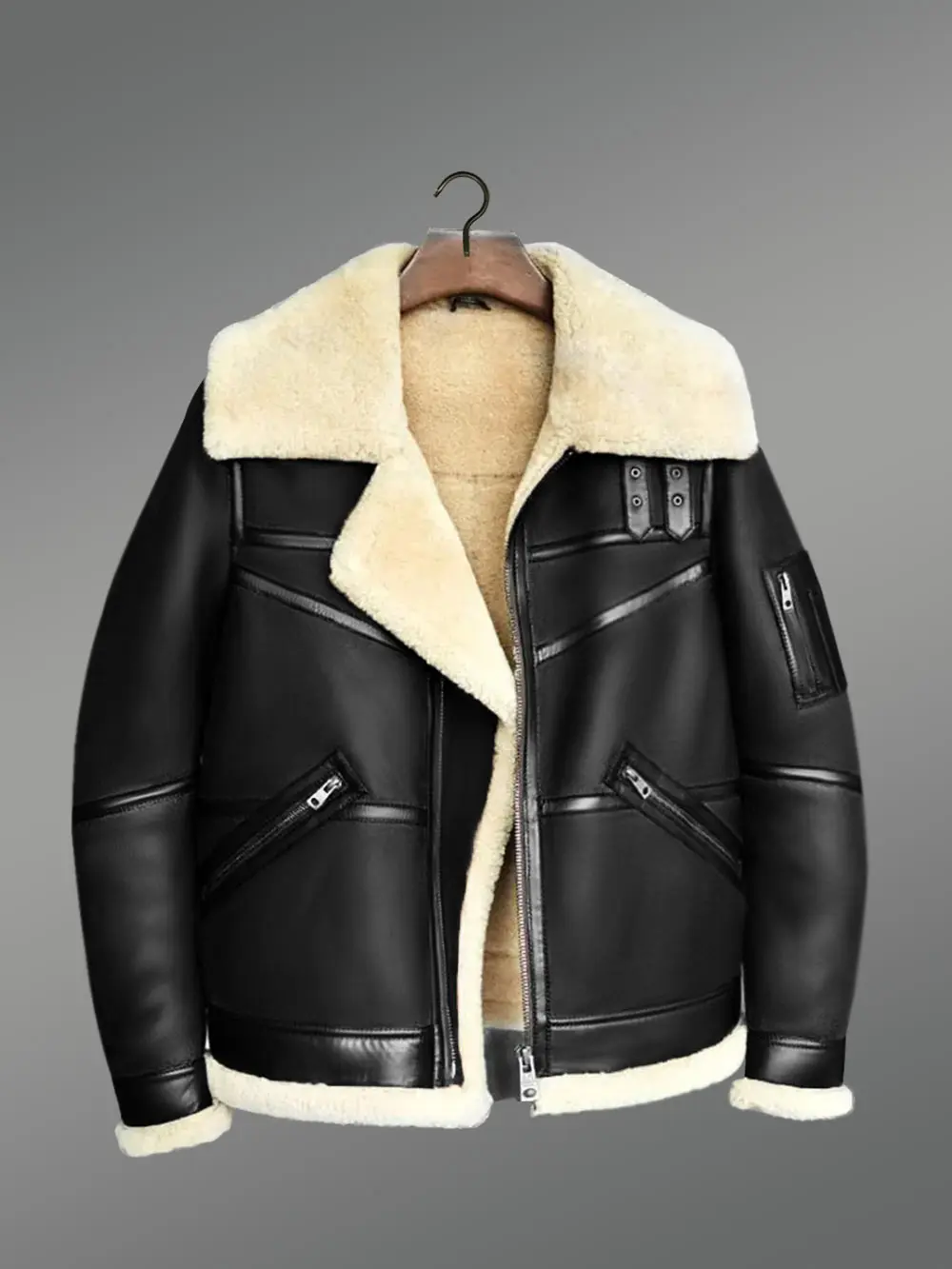 The inner wool is exposed to most parts of this black shearling jacket. The light yellowish sheepskin wool is well layered on the Moto jacket. From the collar to the zipper lining area, the sheepskin woolen layer is well ornate. The wollen patches are also included on the cuffs as well as the bottom edge of the jacket.