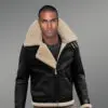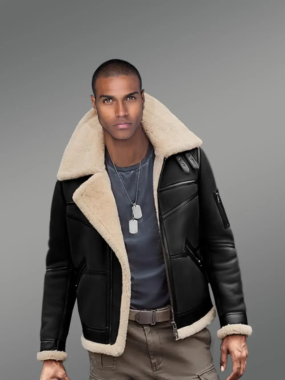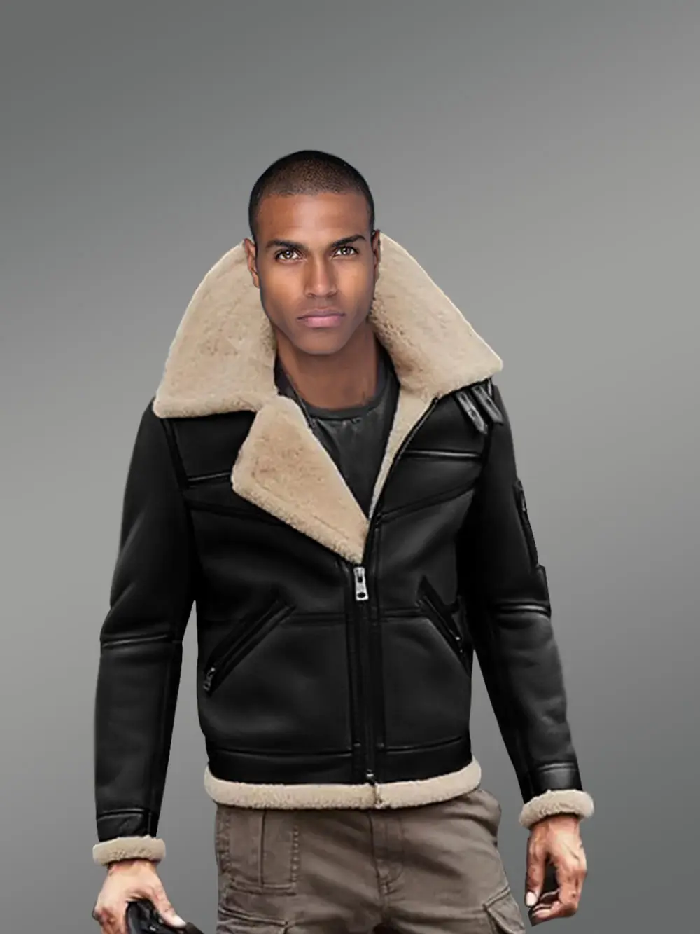 Designed with care, caution and precision, the moto style shearling has the best features included. To ensure insulation, the incorporation of high-quality chrome-finished zippers placed at the center. The body of the jacket comes with a faded finish in black. The highlighting part of the jacket is the authentic leather trims all over. This includes the frontline, the cuffs of the wrist area, the bottom edge, the arms, elbow lining, the chest and shoulder area.