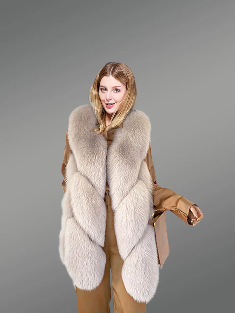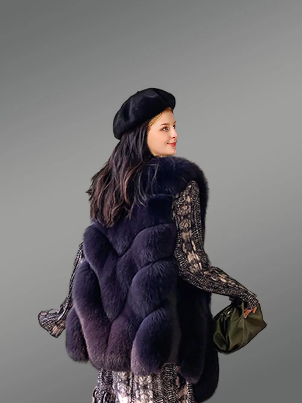 Original pelts of fox make this sleeveless real fox fur waistcoat a versatile outerwear keeping its warmth and tender feel intact all around the clock. It has a dense impenetrable character giving it a baggy fluffy look with a chic appeal. It has been crafted with an intrinsic pure satin lining giving away a smoothened feel to the skin during the entire period of its wear. It has a sleek furry frontline accentuated with a dainty v-shaped neckline.