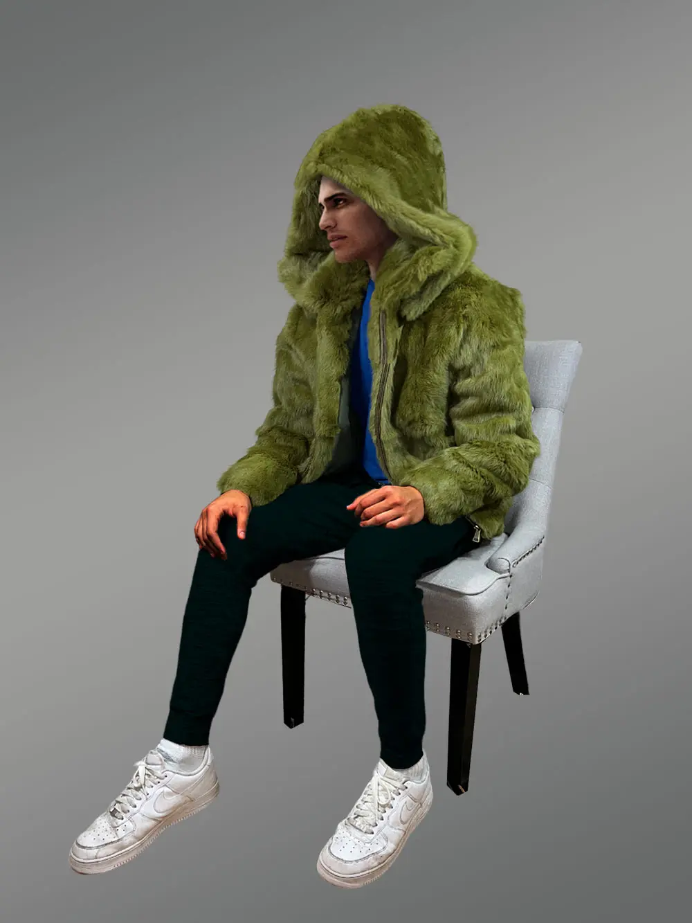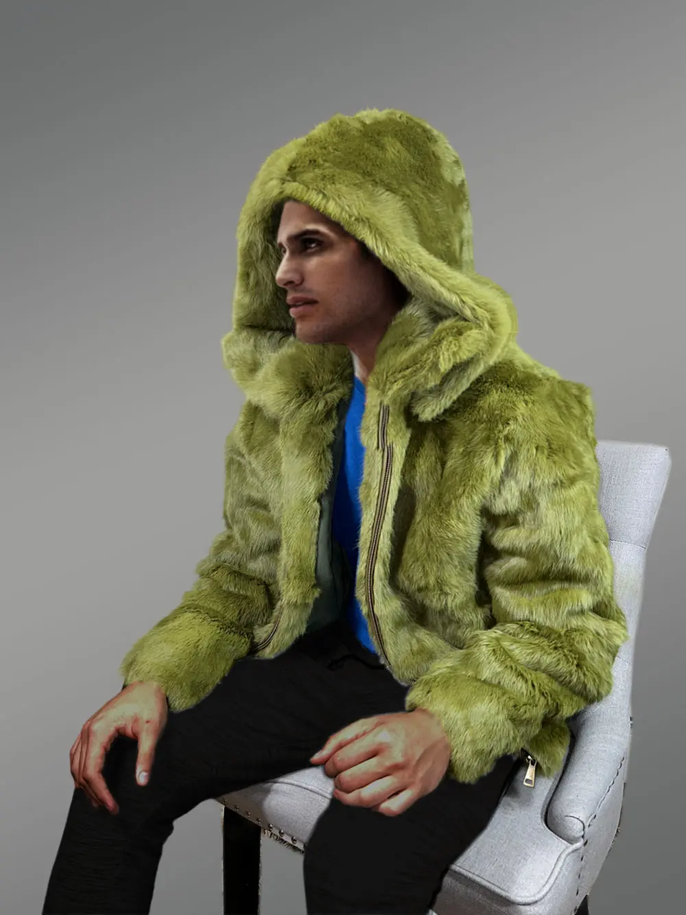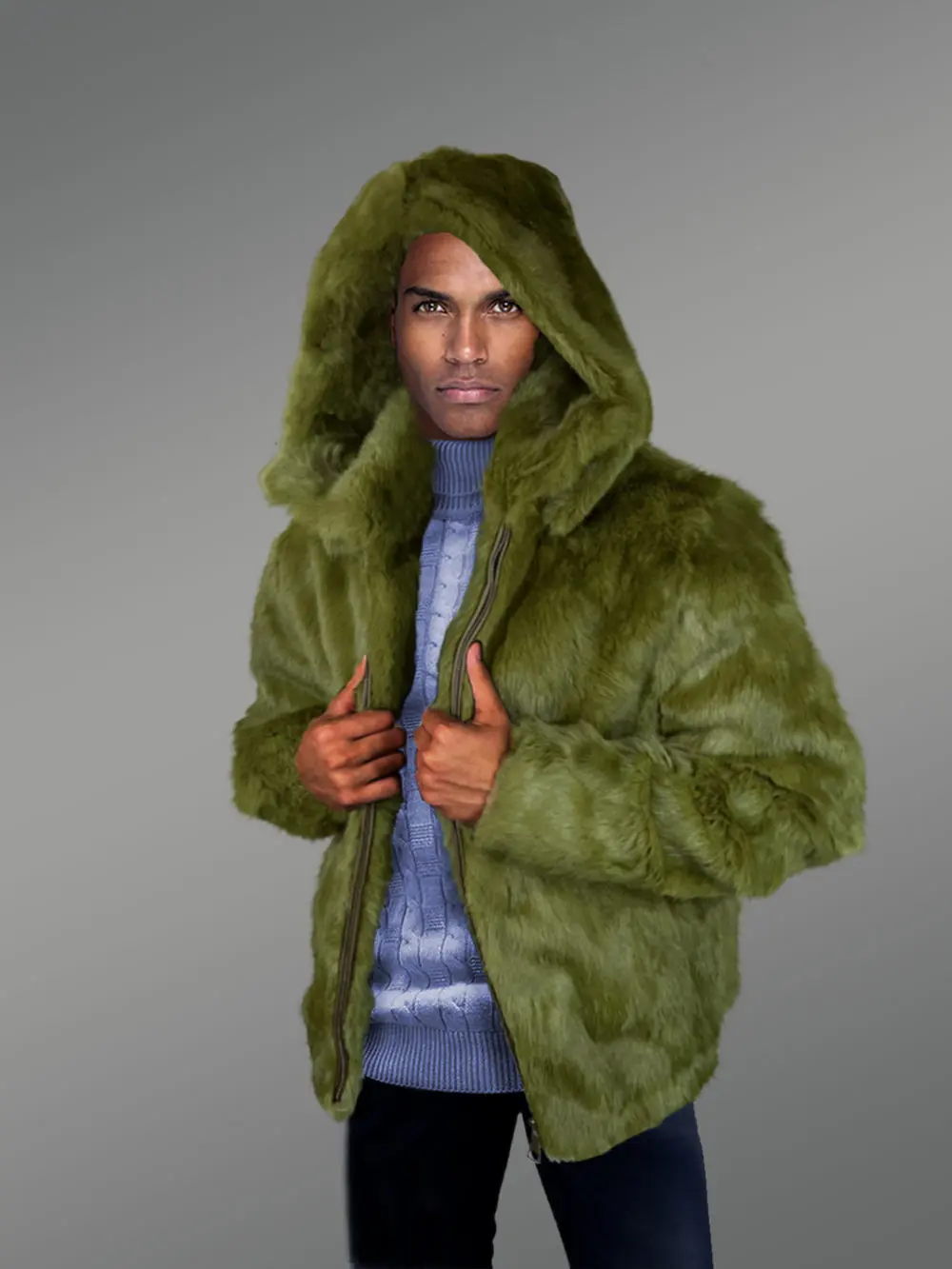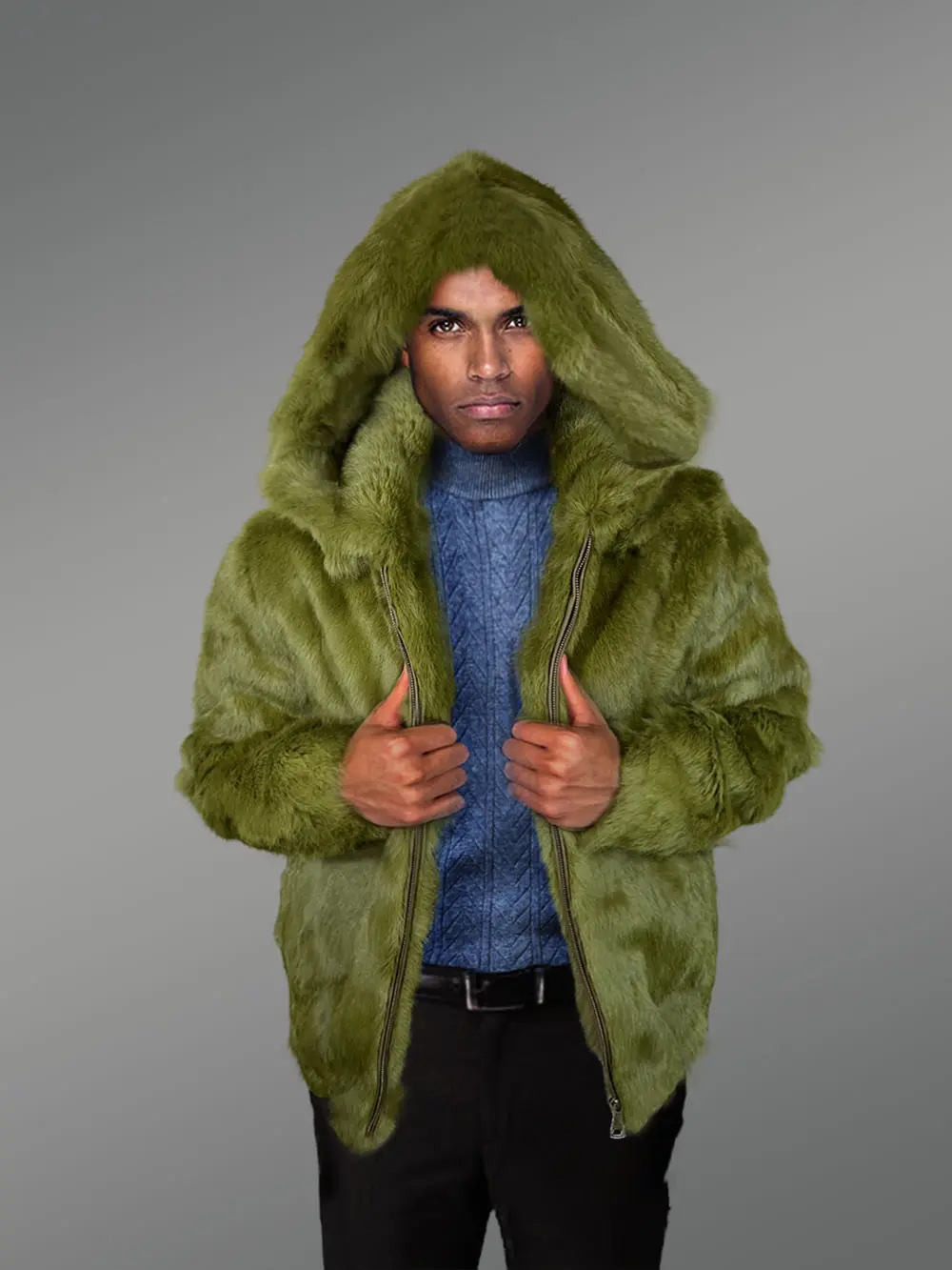 It is truly challenging to withstand the coat’s seductive masculinity and appeal. This winter gear strikes the perfect balance between stylish appearance and practical utility. This outfit is stunning while also being on-trend in the fashion world thanks to the pure rabbit fur plates dyed Olive. The hood and wide collar, both made of the finest Olive rabbit fur, are the highlights of the appearance and are guaranteed to turn heads. It is a perfect look for festivities.