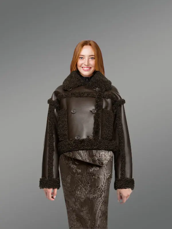 Shearling Double Breast Crop Jacket for Women in Coffee