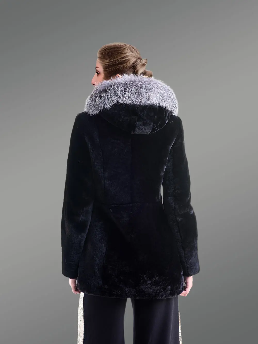 This Women’s Sheep Wool Coat with Fox Fur Collar is made to feel smooth, thick, with lustrous guard hairs which is longer and coarser. This Waist Length Jacket is of Golden Hue because Silver Fox Fur on Collar and Cuffs.  This wonderful plush Sheep Wool Coat has two hand-warming Side Pockets and a Finest Quality Metal Clip Lock closures.