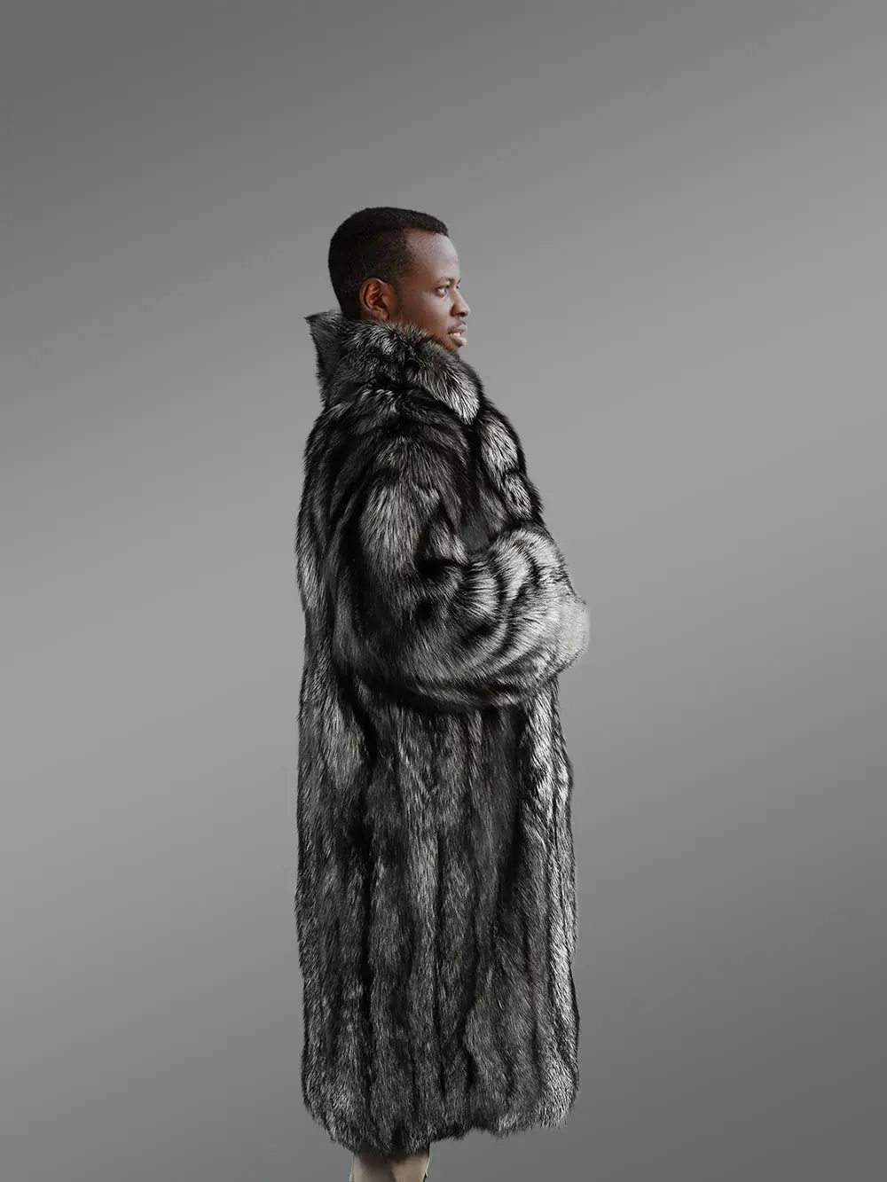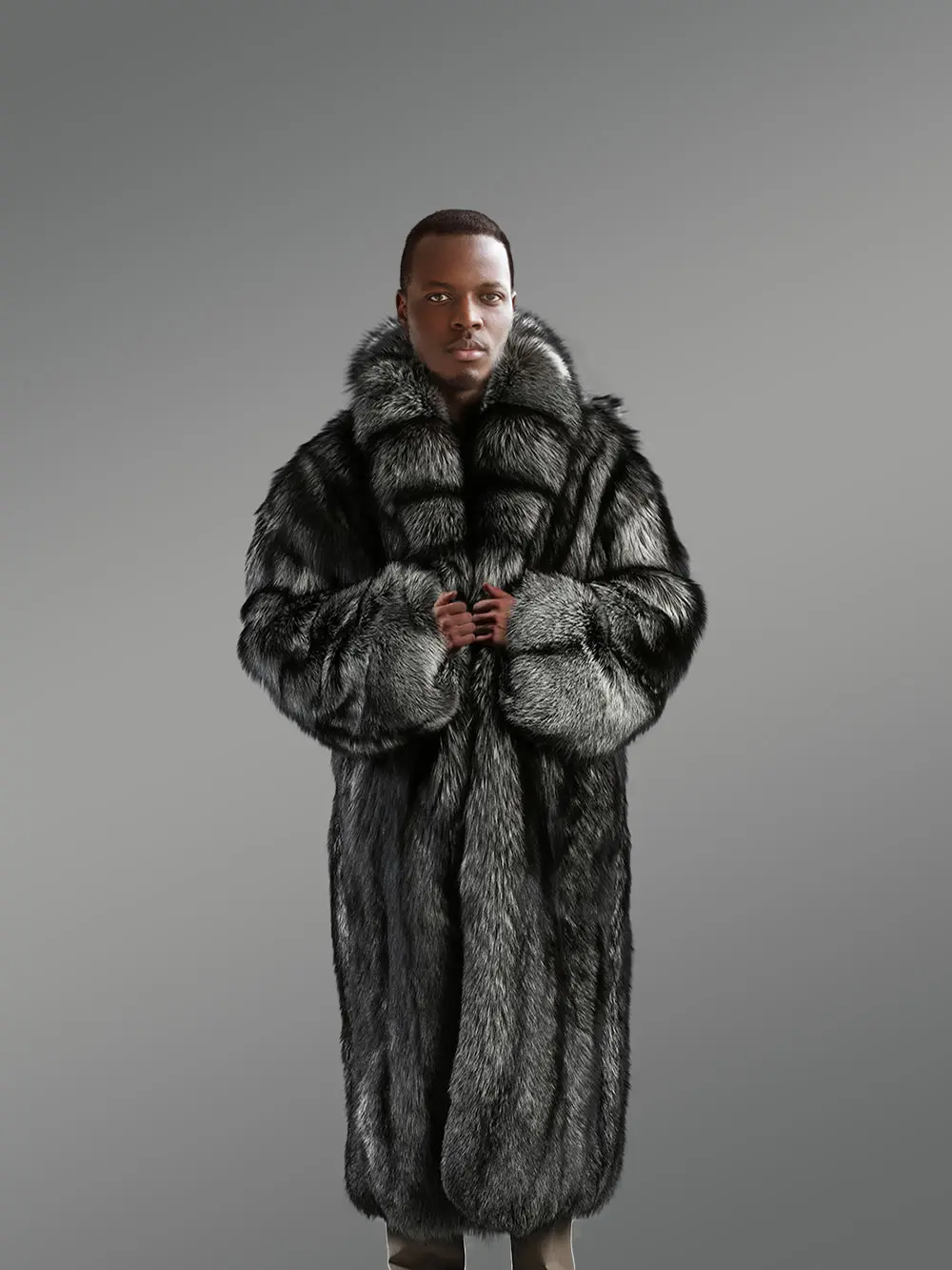 This plush winter wear for men showcases a broad shawl style collar skillfully designed from natural silver fox fur. This warm lapel safeguards the neck and the chest from chilling weather by offering comforting warmth to the body. The hemline of this trench coat of silver fox fur runs below the knee therein enveloping the wearer in cozy warmth. It features fluffy baggy sleeves keeping both hands warmly covered in coziness. Furthermore, slit pockets on either side keep both palms guarded from freezing temperatures. Simultaneously they are also useful for carrying some essentials. It is available in all sizes for men making it an absolute wear for parties or grand celebrations.