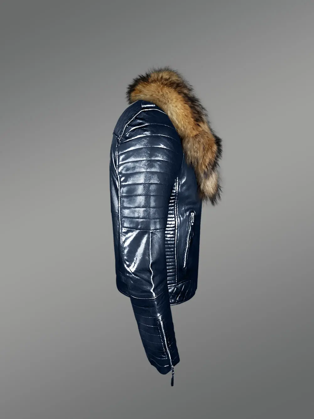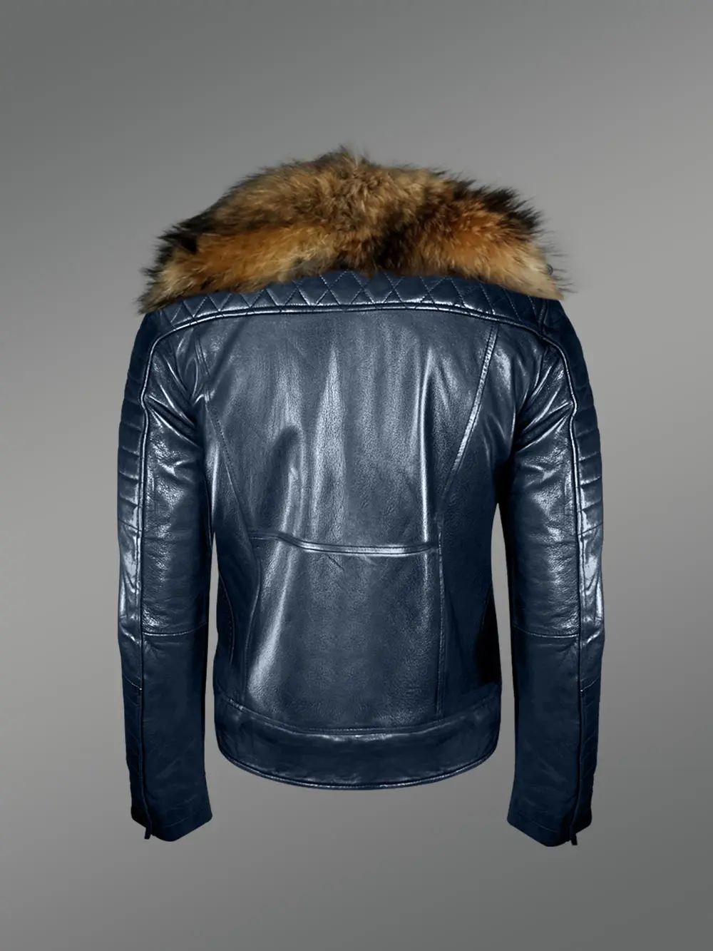 Super Stylish Real Leather Winter Biker Jacket with Raccoon Fur Collar for Men to enjoy the winter time activities without in comfortable warmth. It’s handcrafted with attention to details using finest quality material. Thus, this chic winter-wear is going to last for years with minimum maintenance. It looks magnificent in navy blue with soft shine because of aniline dye. Additionally, this preserves the natural traits of lamb hide.