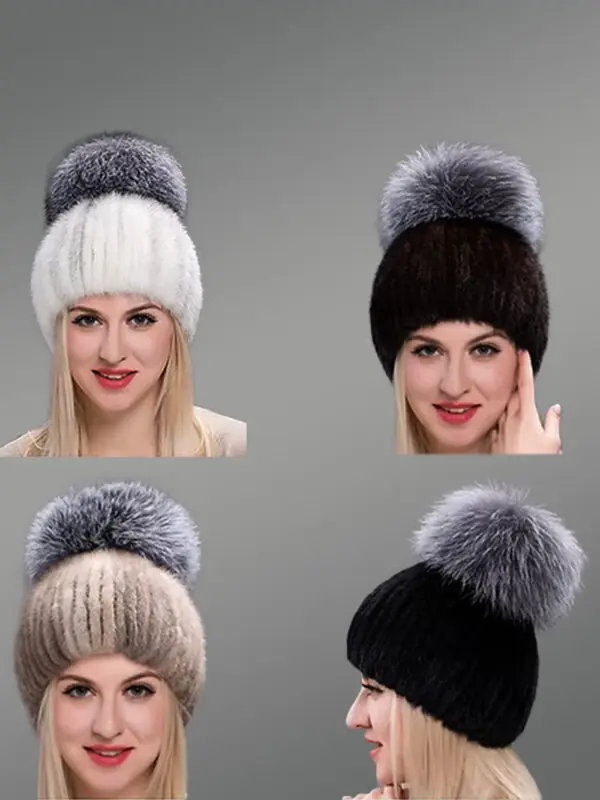 Tail Mink Beanie Hat for Women with Oversized Silver Fox Fur Pompom