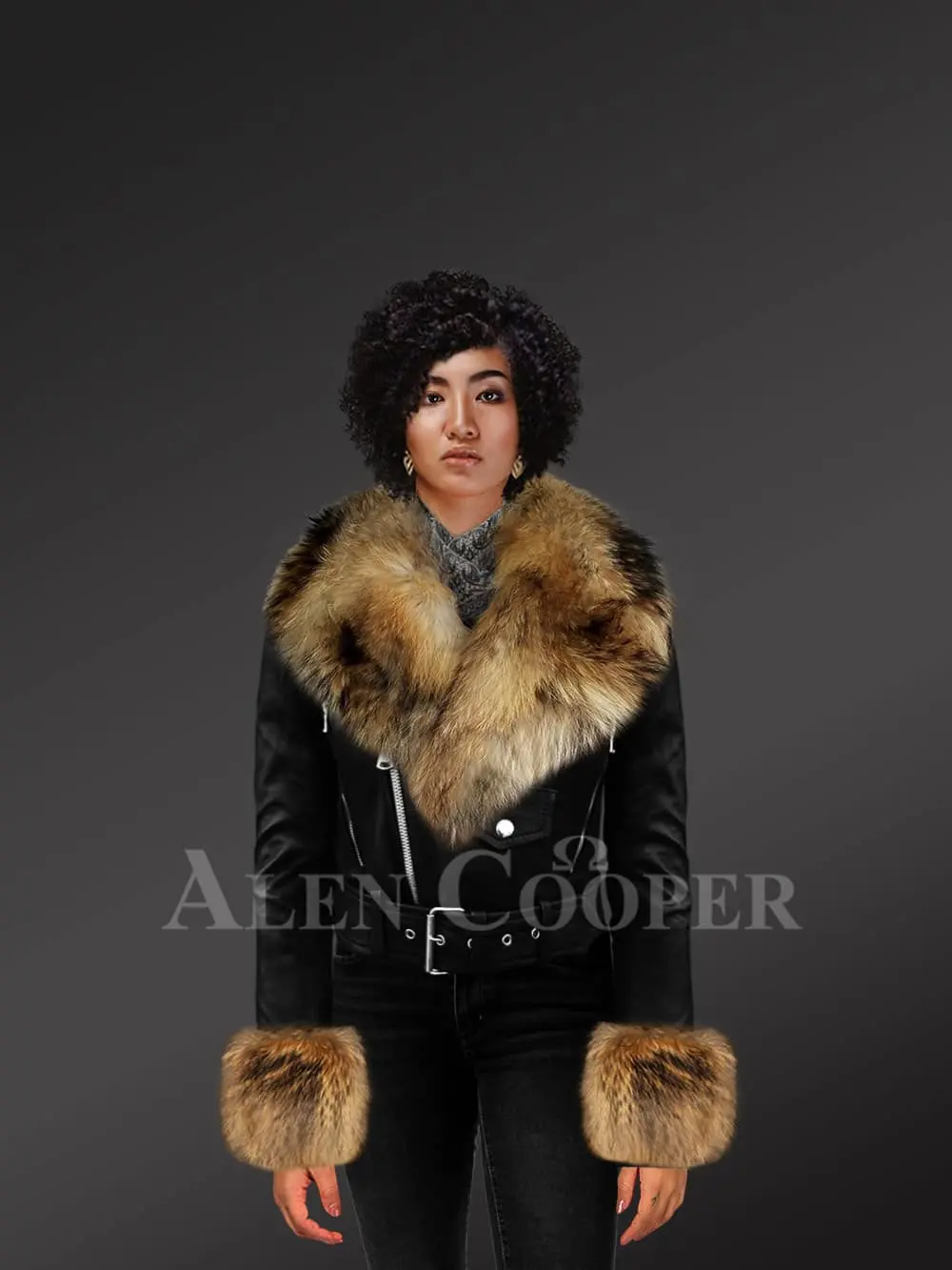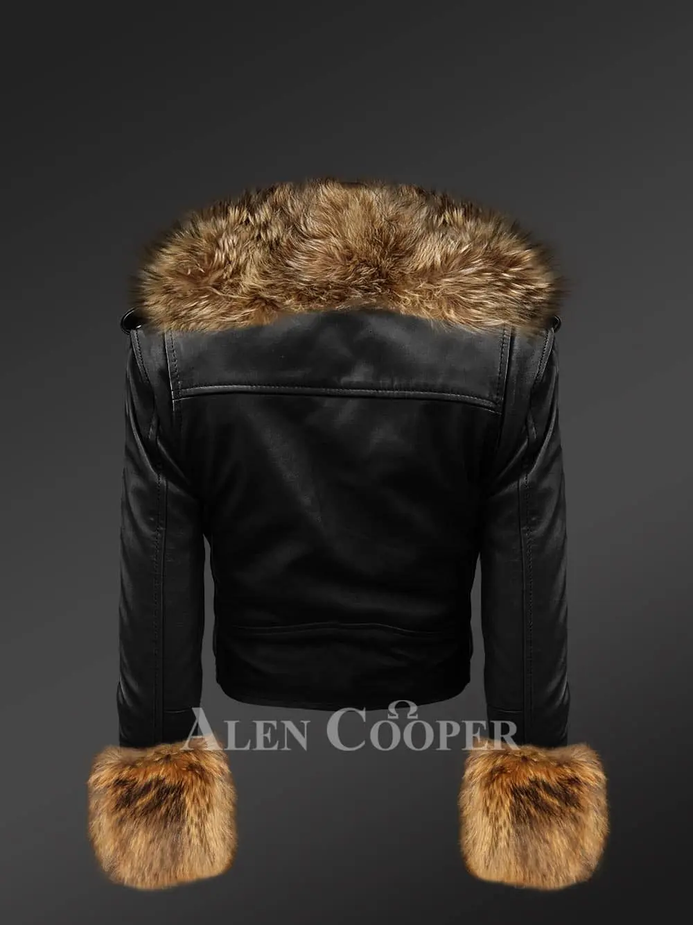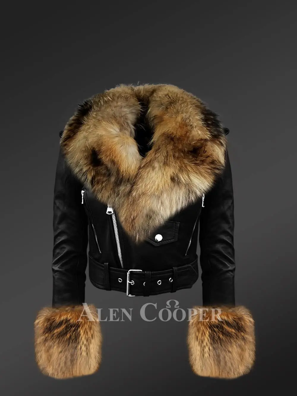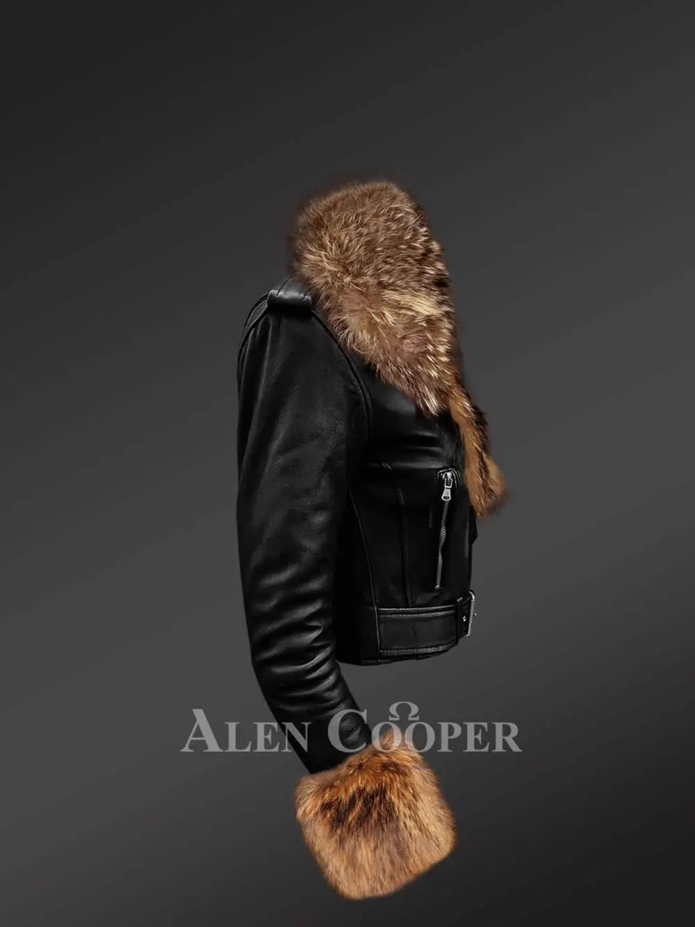 • The leather jacket has a striking collar and handcuffs made from original pelts of Finn raccoon fur