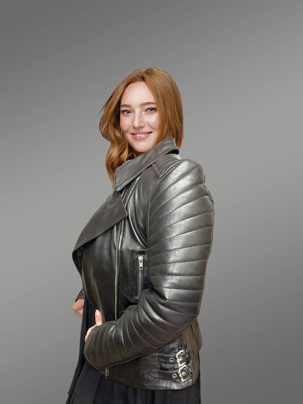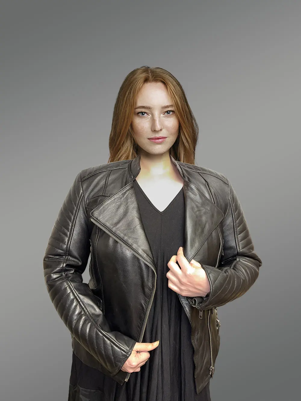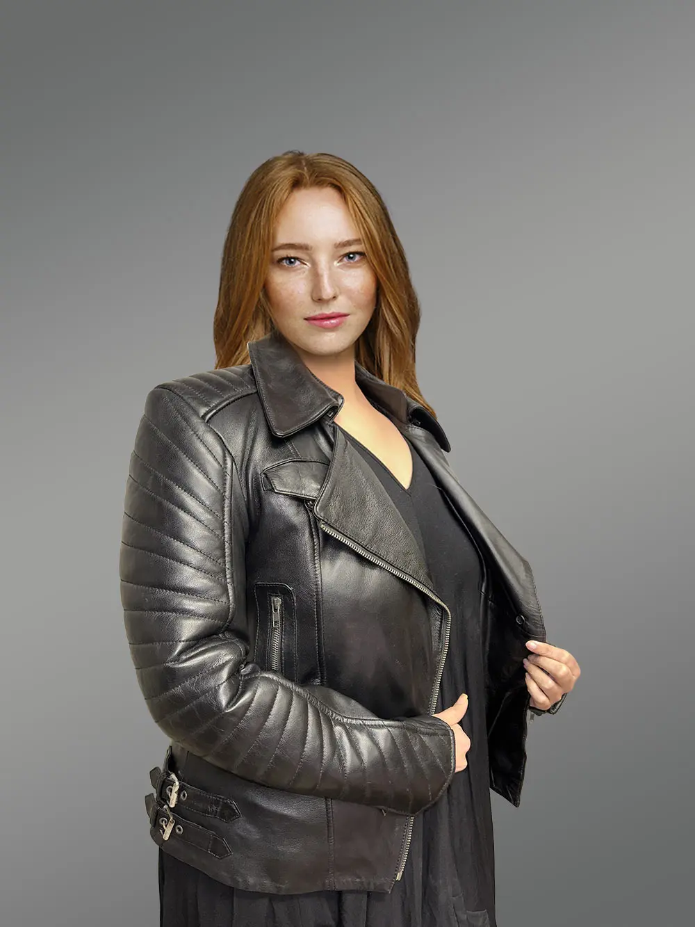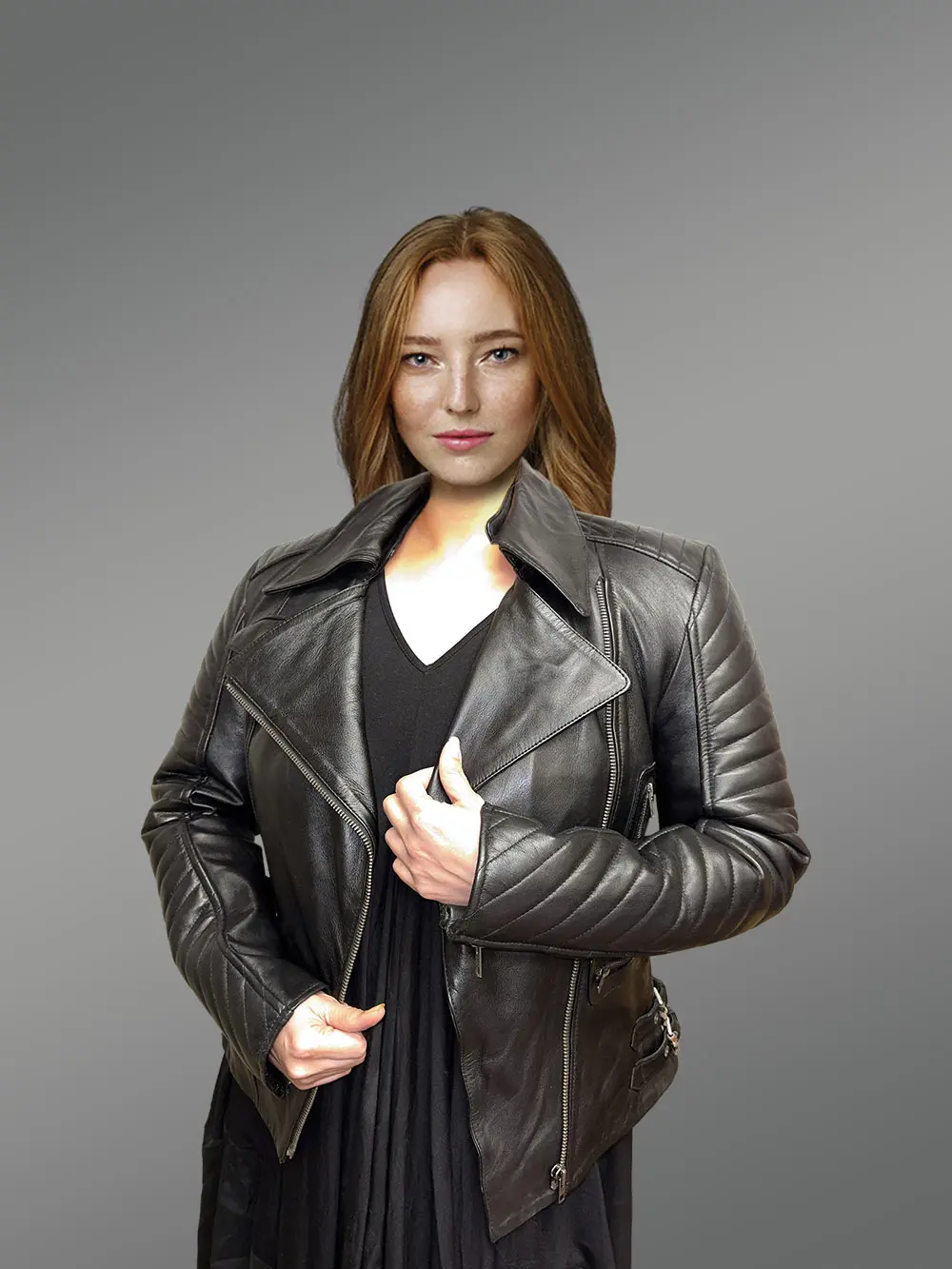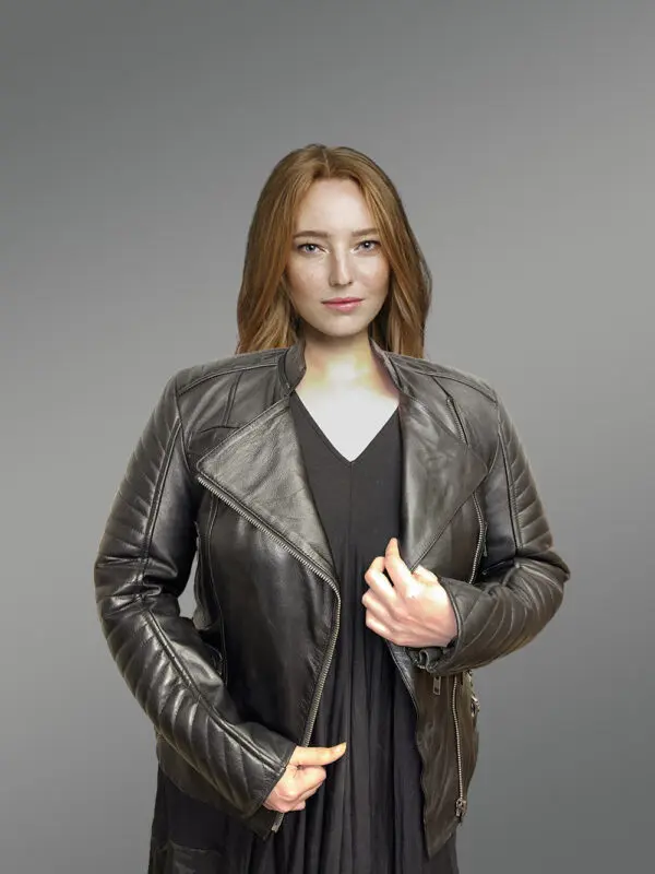 This chicwomensblack lambskin leather biker jacketwill captivate anyone with its fashion-forward looks.Designers have used premium lambskin leather to handcraft an outfit that will last for decades without going out of style. Theribbed quilting detail along the sleeves isn’t just a glamorizing feature. It offers more warmth and comfort whilst preventing serious injuries in the event of an accident. This outfit isn’t just for looking chic whilst riding a bike. It can make one look like a showstopper at any event.