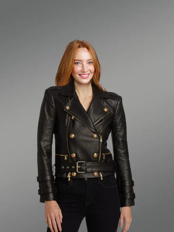 This womens cropped moto leather jacket accessorized with chrome-finished golden metallic zippers, takes the aesthetics slightly higher. This double-breasted jacket adorned with rose gold buttons and an asymmetrical zipper closure creates a stellar look for women. Leather epaulet can be noticed on each side of the shoulder. Spacious zippered spacious pockets in horizontal pattern feature on either side of the waistline. The most striking feature of this gorgeous moto jacket remains its detachable belt at the hemline. This chunky belt with buckled design offers a spectacular look with a snug fit to the wearer’s body. This ritzy outerwear perfectly fits with stylish bottom wear like leather pants, linen trousers, denim, or even mini or long skirts.