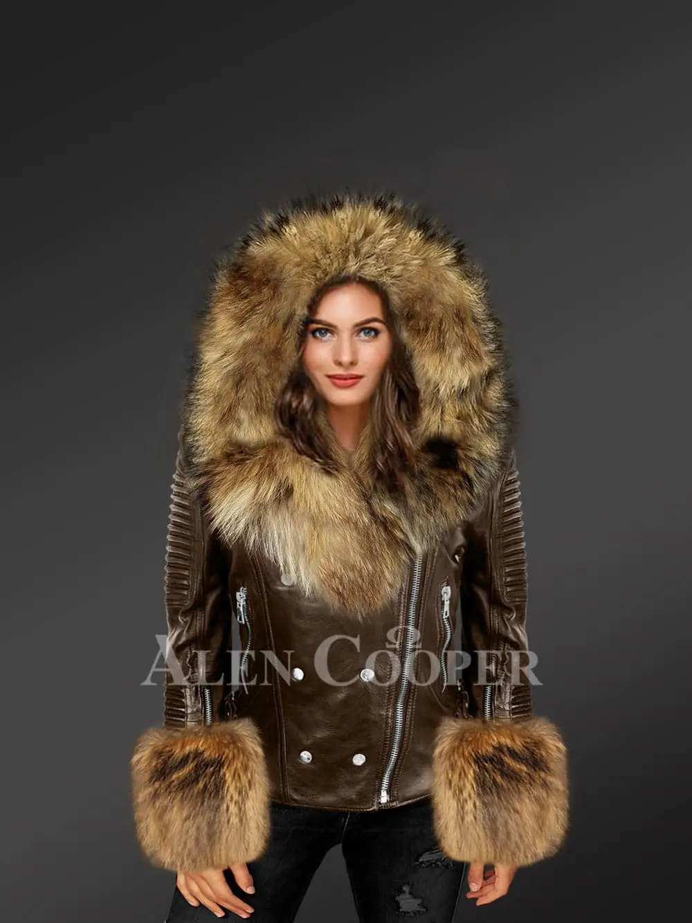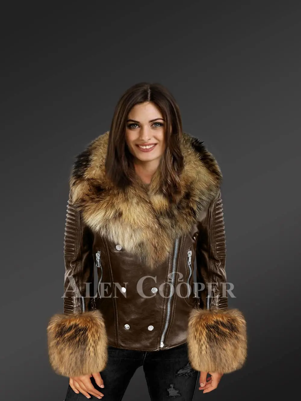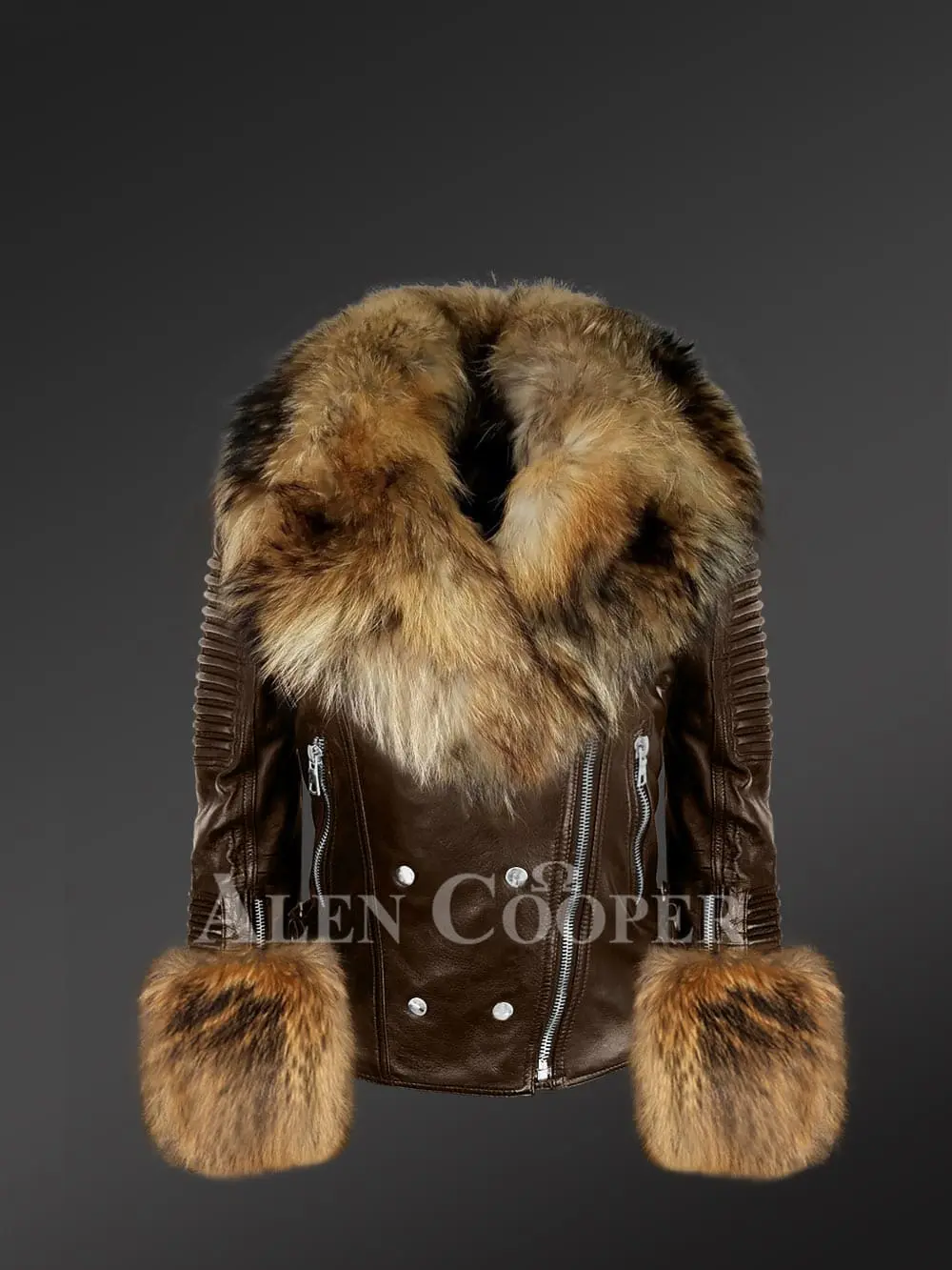 This posh and fashionable womens leather with fur biker jacket will undeniably be a valued addition to one’s wardrobe. This statement piece can instantly elevate the appearance of any woman. Its bold looks are perfectly complemented by the elegance of raccoon fur that highlights different parts. It’s designed with a metal zipper as well as fashionable silver buttons in the front. It also has leather padding for protection to the wearer in the event of an accident and zippered side pockets.