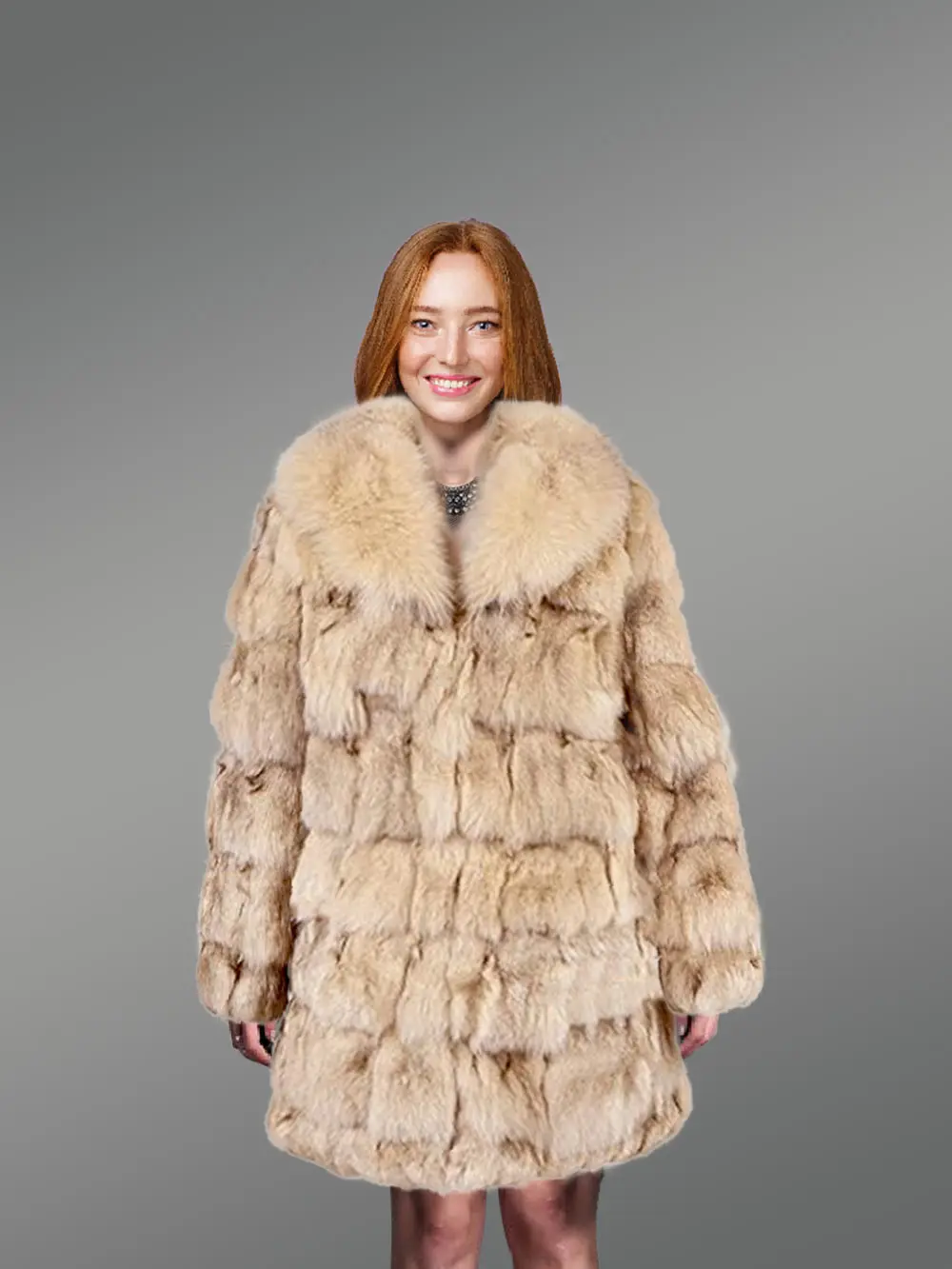 Women’s Mid Length Fox Fur coat with Fox Fur Collar in Beige