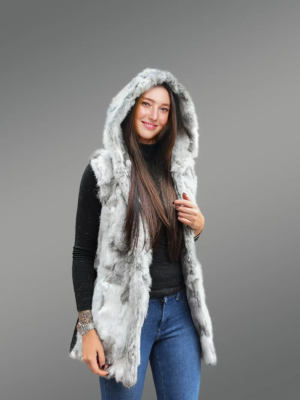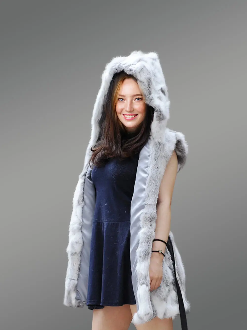 High-End quality real rabbit fur is known for its perpetual warmth and comfort. The classic vest has its shell crafted of pure rabbit fur and extends its quality of imparting a soft touch through its natural being. An overall carved texture design leaves an artistic impression that defines its uniqueness. The anomalous texture pattern causes its grey hue to reflect a fusion of parallel contrasting shades of grey throughout.