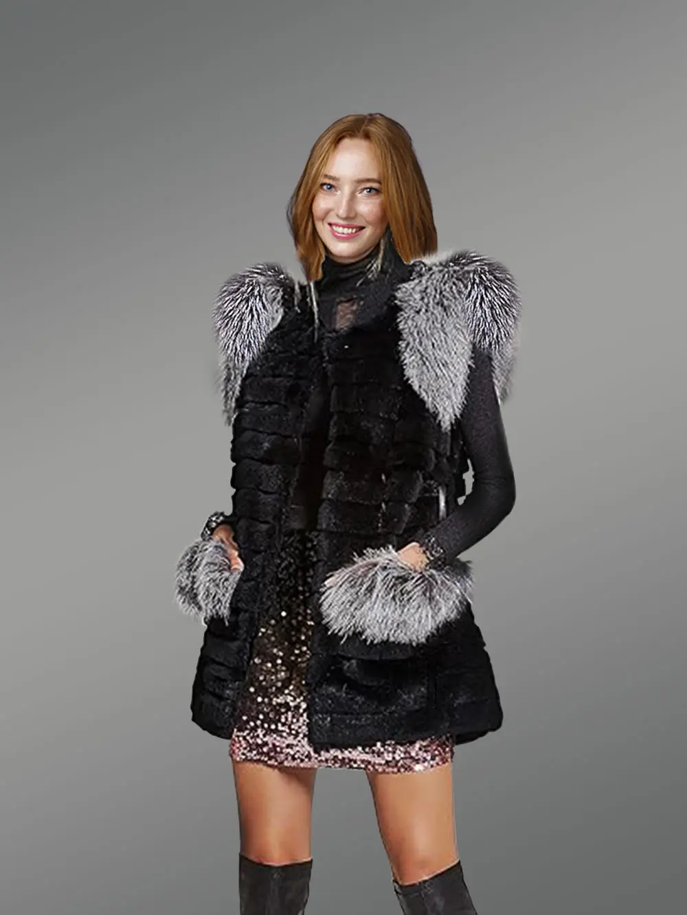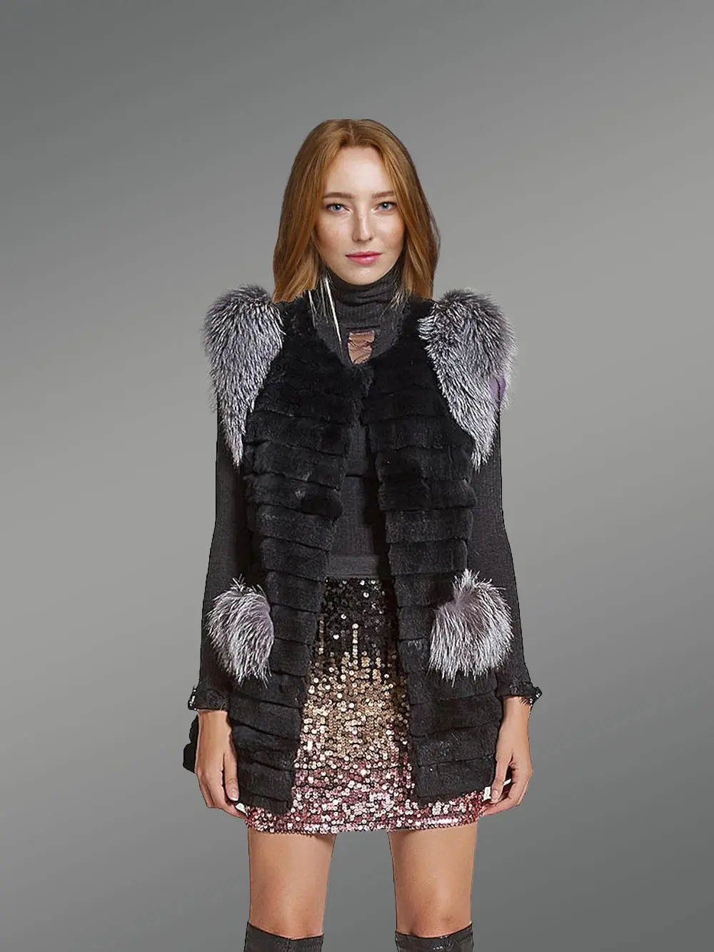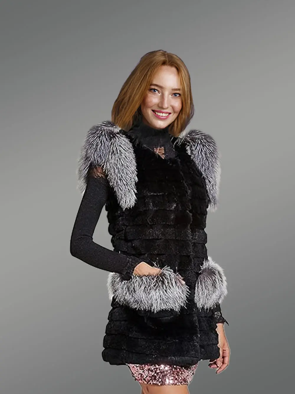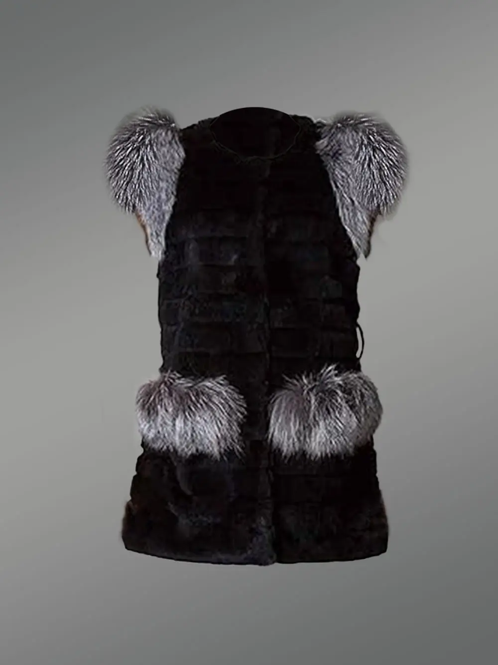 The unique aesthetic appeal of this vest results from the harmonious combination of rabbit fur and fox fur. The grayish silver color of the fur from Silver fox looks appealing in contrast to the black rabbit fur. The pelts of fox fur accessorize this outfit and add to its glamour. At the same time, they offer more warmth to a wearer.